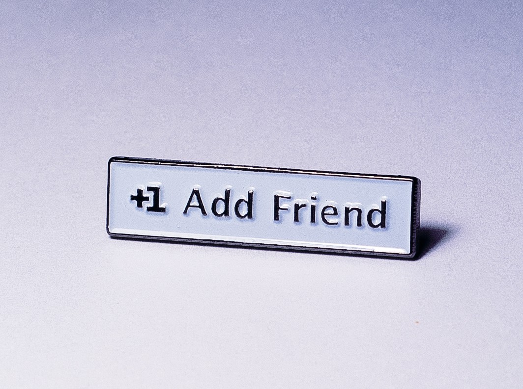Schämen Sie sich nicht, Ihre zu zeigen Facebook-Sucht. Brosche +1 Freund hinzufügen Es hat genau die gleiche Form wie der rechteckige Freunde-Button von Facebook, der zum neuen Standard geworden ist Freunde finden.