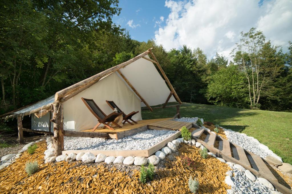 Es steht Ihnen auch zur Verfügung glamouröses und geräumiges Soška Deluxe Bett, das mehr Privatsphäre bietet. Das attraktive Zelt ist mit einem interessanten handgefertigten Bett, Nachttischen, einem Couchtisch und einer Sofagarnitur ausgestattet. Das luxuriöse Zelt bietet eine schöne Terrasse mit zwei Holzstühlen und einem Tisch, vor der sich ein wunderbarer Blick auf die Julischen Alpen bietet. Im Frühjahr und Herbst ist das Zelt beheizt.