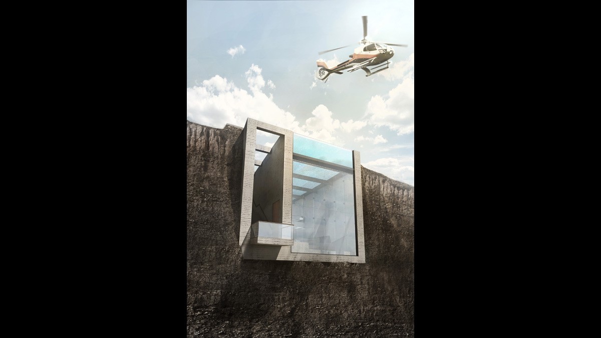 Casa Brutale es ist ein Symbol für Einfachheit und Harmonie der modernen Architektur. Es ist eine Studie über Ästhetik, Struktur, Funktionalität und Technik, die ihren Ursprung in hat Offene Plattform für Architektur (OPA) und hofft, dass daraus eines Tages ein richtiges Projekt wird. Inspiration dafür holten sie sich aus dem Haus Casa Malaparte, aber anstatt über dem Boden zu sitzen, ist es zwischen den Felsen eingeklemmt.