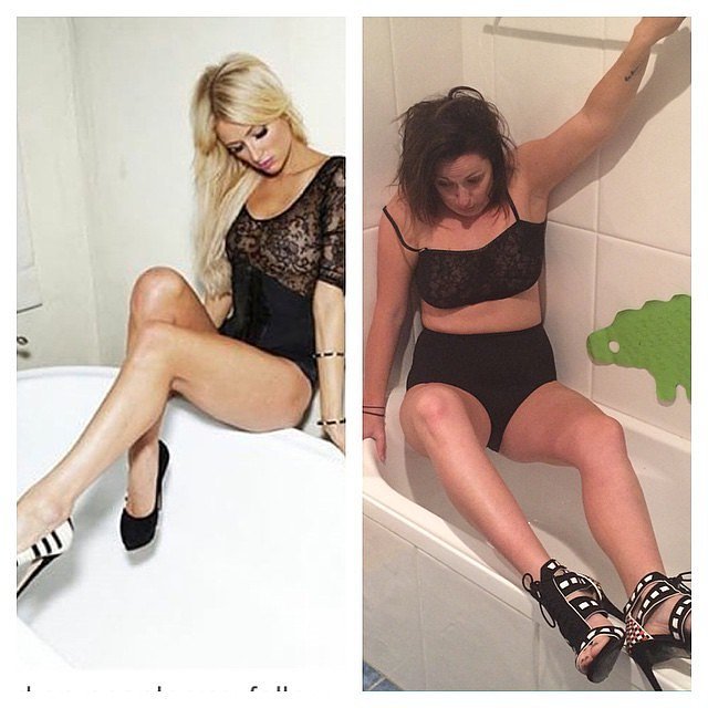 Selbst wenn Prominente in Trainingsanzügen, mit hochgebundenen Haaren und ohne Make-up posieren, kommen ihre Fotos etwas besser heraus als unsere. Die australische Komikerin Celeste Barber hat diese unglückliche Realität in eine lustige Fotoserie auf Instagram verwandelt, in der sie ihre Nachbildungen neben Bilder der Stars stellt – alles unter dem „Hashtag“ #celestechhallengeaccepted.