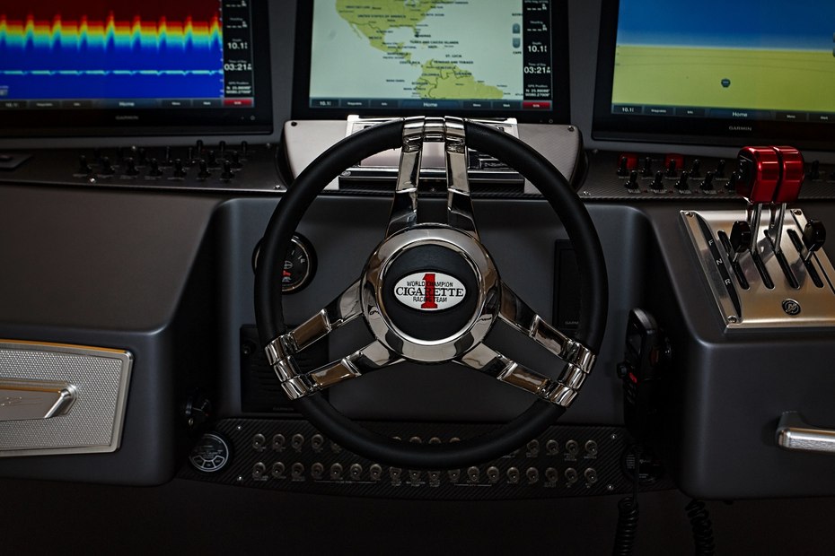 Das 12,5 Meter lange Schnellboot wird von zwei Motoren angetrieben Mercury Racing V8, die ein ganzes Bataillon an PS aus dem 9-Tonnen-Biest herausholt (1100 PS). Es ist das leistungsstärkste Schiff auf dem Markt mit einer Höchstgeschwindigkeit von 217 km/h.