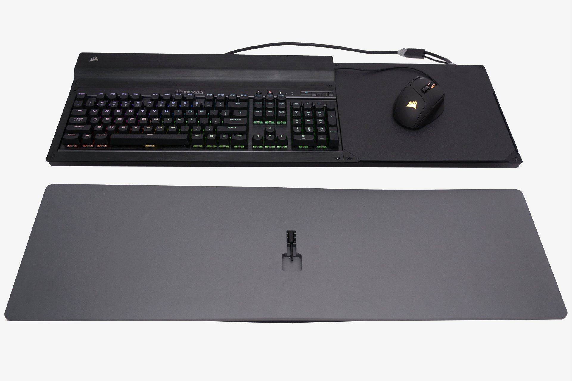 Corsair Lapdog ist "nur" fortgeschrittene Oberfläche mit einem Tastatursteckplatz (unterstützt derzeit nur die Tastatur von Corsair, nämlich die Tastatur K65 und K70, und in der Zukunft versprechen sie diverse Öffnungen, in die sie schlüpfen können auch Tastaturen anderer Hersteller und wird nicht nur "Eingeweihten" vorbehalten sein), ein Mauspad und einige andere technologische Goodies.