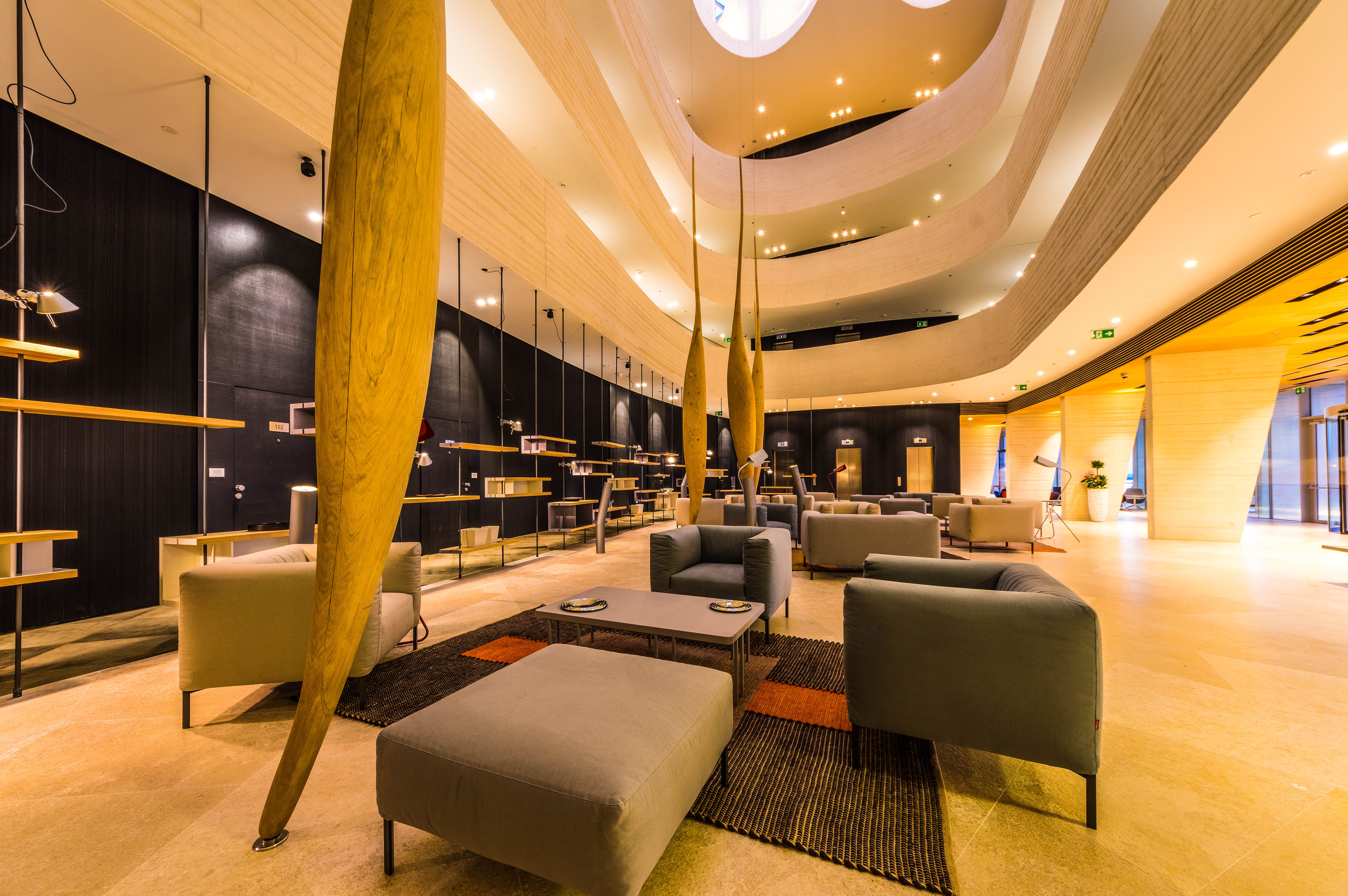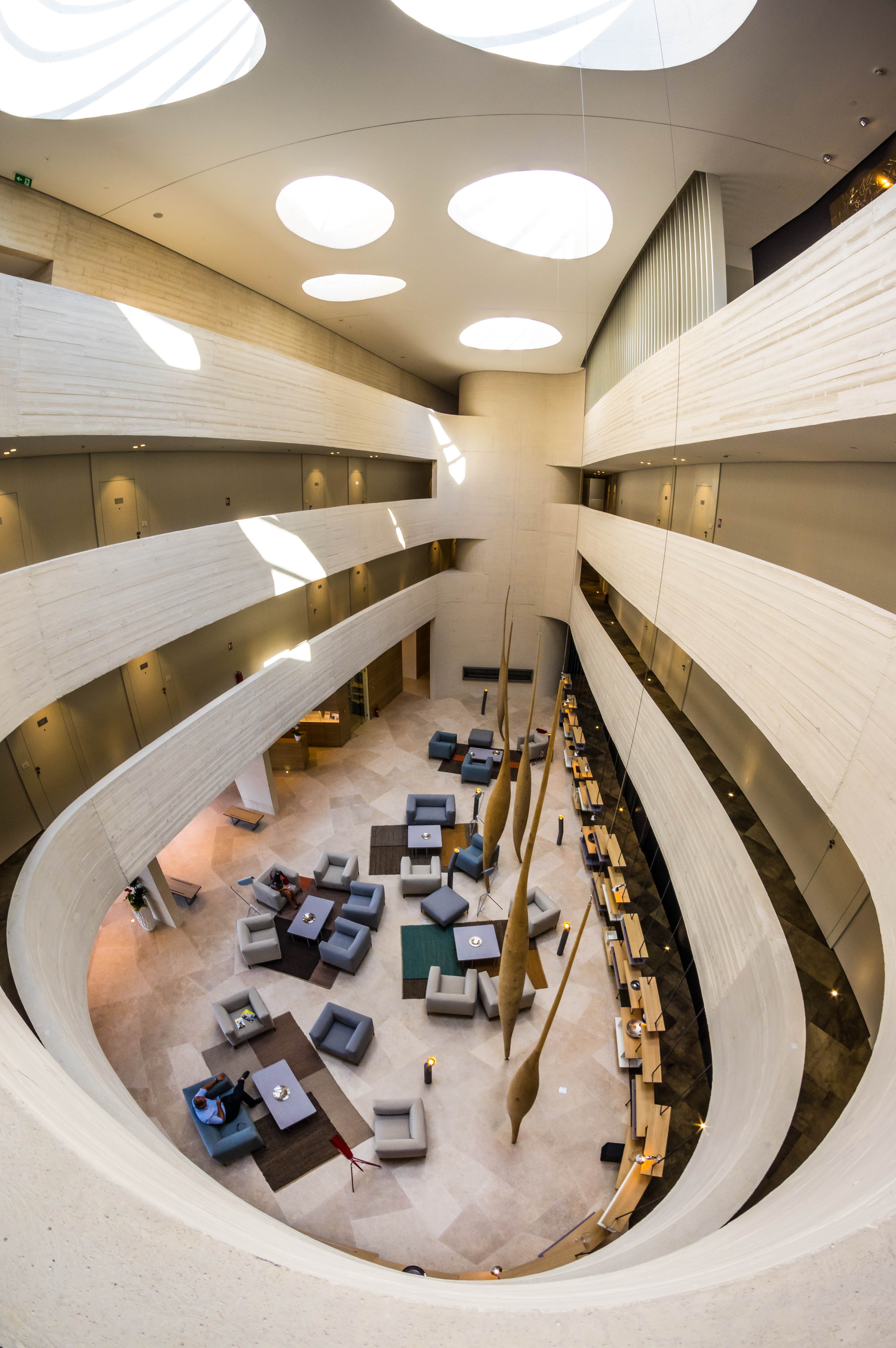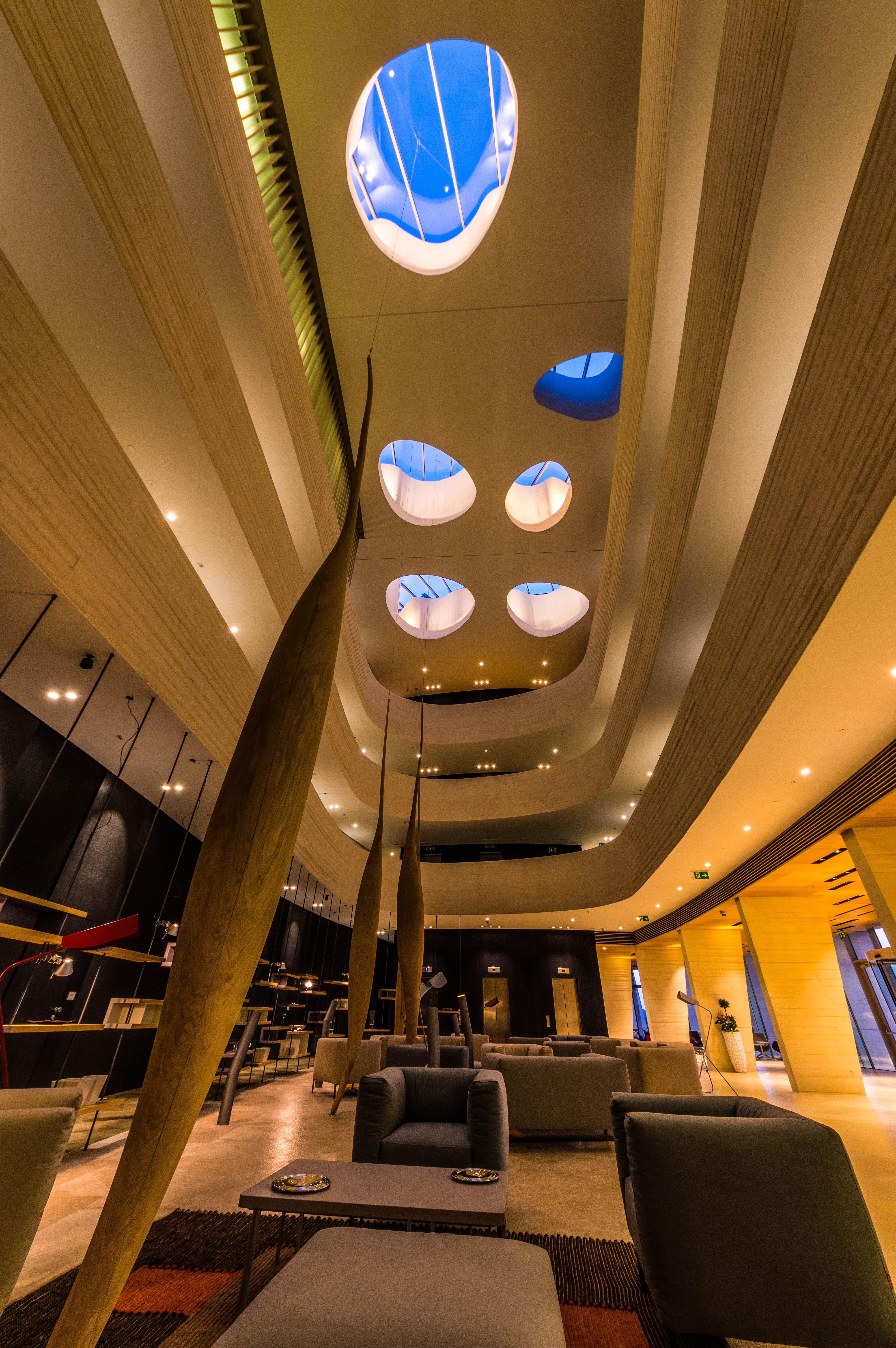 Architekturdesign ergänzt das Gebäude auf natürliche Weise Landschaft und Umwelt. Für die Außen- und Innendekoration wurden nur drei Materialien verwendet – Beton, Holz und Glas, die sowohl ökologische als auch ökonomische Aspekte berücksichtigen Nachhaltigkeit der Anlage, während die Fassade aus weißer Beton ergänzt das gedruckte Holzprobe, was beim Besucher einen angenehmen Eindruck hinterlässt der Eindruck von Natürlichkeit.