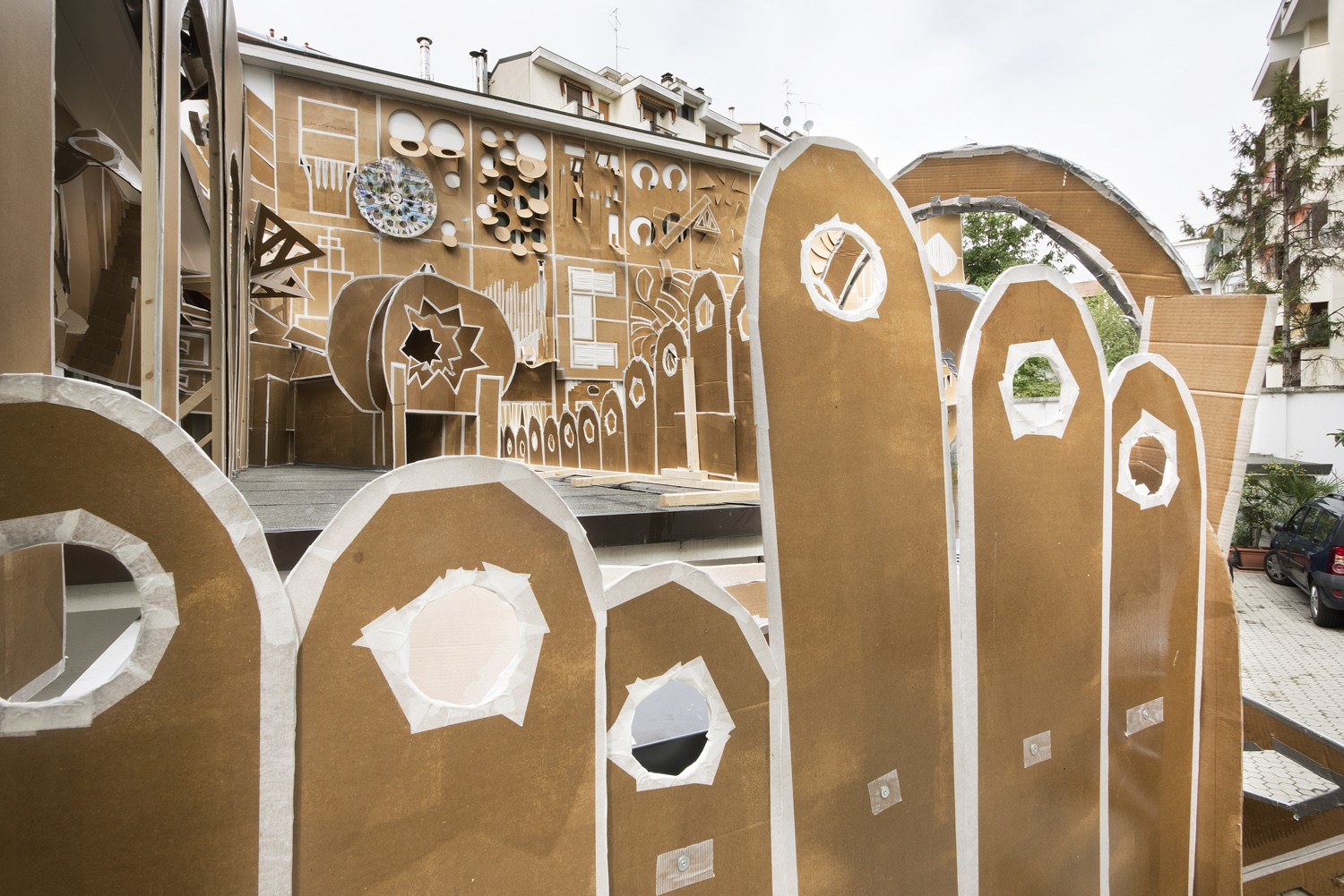 In einer Mailänder Straße stellte er eine Pappinstallation auf, die uns an etwas erinnert, das wir bisher nur in dreidimensionalen Kindermärchen, Zeichentrickfilmen oder Träumen sehen konnten. Es ist ein großes Pappmärchen lehnte an Gebäudewänden und so ein Pappsymbol von Mailand geschaffen, das bis etwa Ende des Monats besichtigt werden kann bis zum ersten heftigen Regen.
