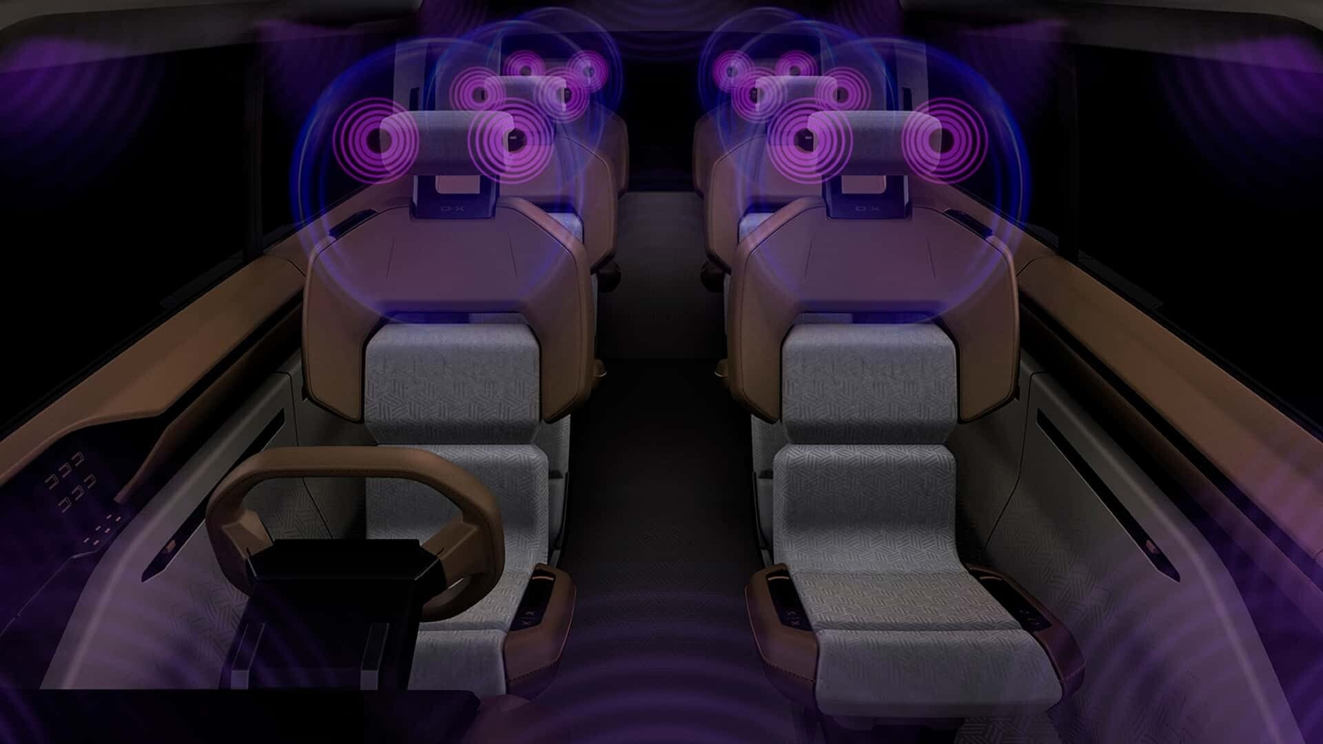 Darüber hinaus lassen sich die mit hellbraunem Leder bezogenen Sitze nicht nur hin und her verschieben, sondern die Vordersitze können auch um 180 Grad gedreht werden. In jeder Kopfstütze sind Yamaha-Lautsprecher verbaut, die für ein hervorragendes Klangerlebnis während der Fahrt sorgen3. Im Innenraum gibt es außerdem ein paar drehbare und nach oben und unten bewegliche Panoramasitze, die zusammen mit der Frontscheibe und der durchsichtigen Motorabdeckung, die ein weites Sichtfeld ermöglichen, ein luftiges Cockpit ergeben. Dieses Design ermöglicht es dem Fahrer und den Passagieren, kontinuierlich zu fahren, als ob sie in der Luft schweben würden.
