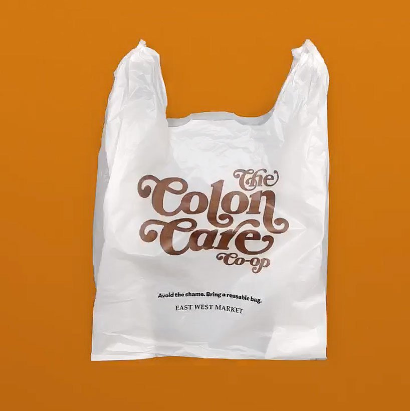 Es bot den Kunden 3 Versionen der neuesten Plastiktüten mit den folgenden Aufschriften: „In das Weird Adult Video Emporium", "DR. Toews Warzensalbe Großhandel" und "Colon Care Co-op". Der erste von ihnen repräsentiert Filmgeschäft für Erwachsene, der Zweite Geschäft für Brustwarzensalben, und die dritte Darmpflegeorganisation.