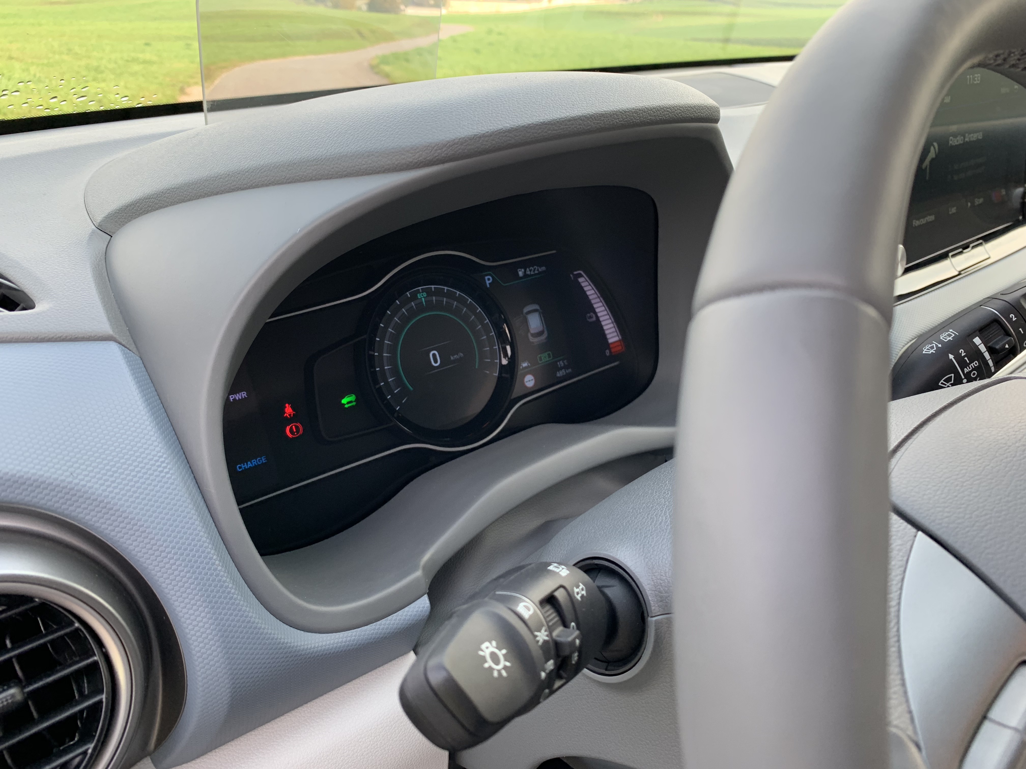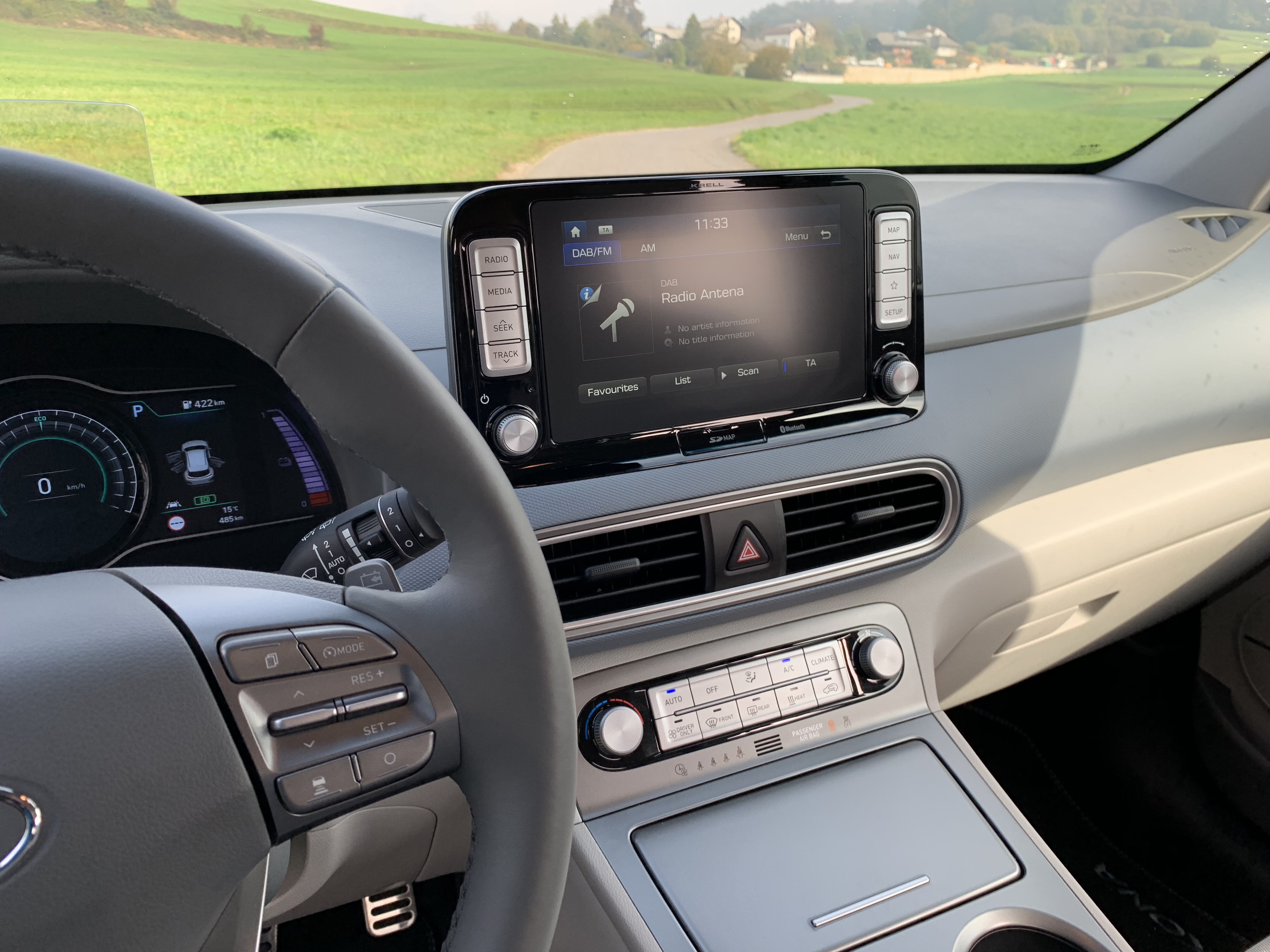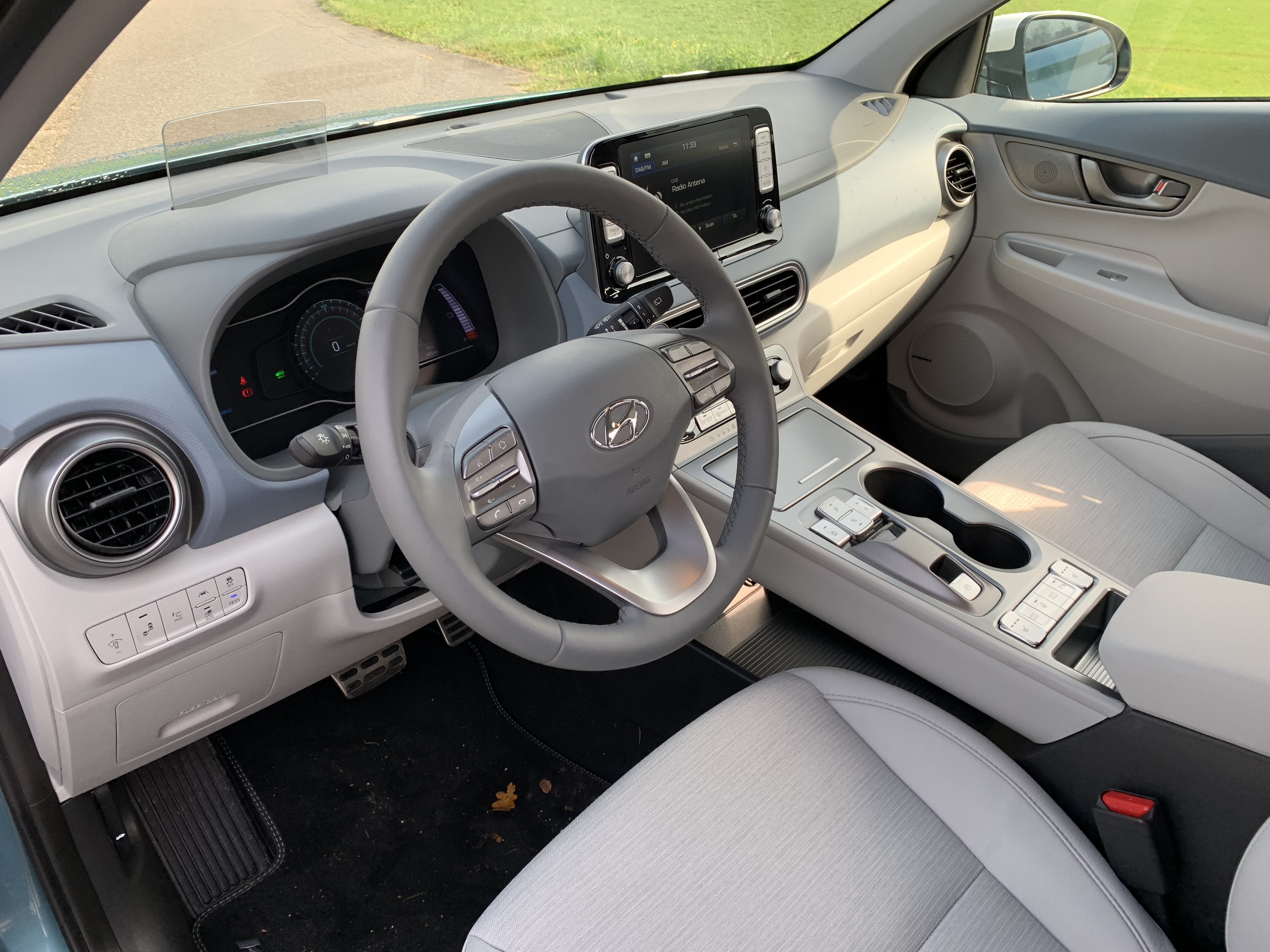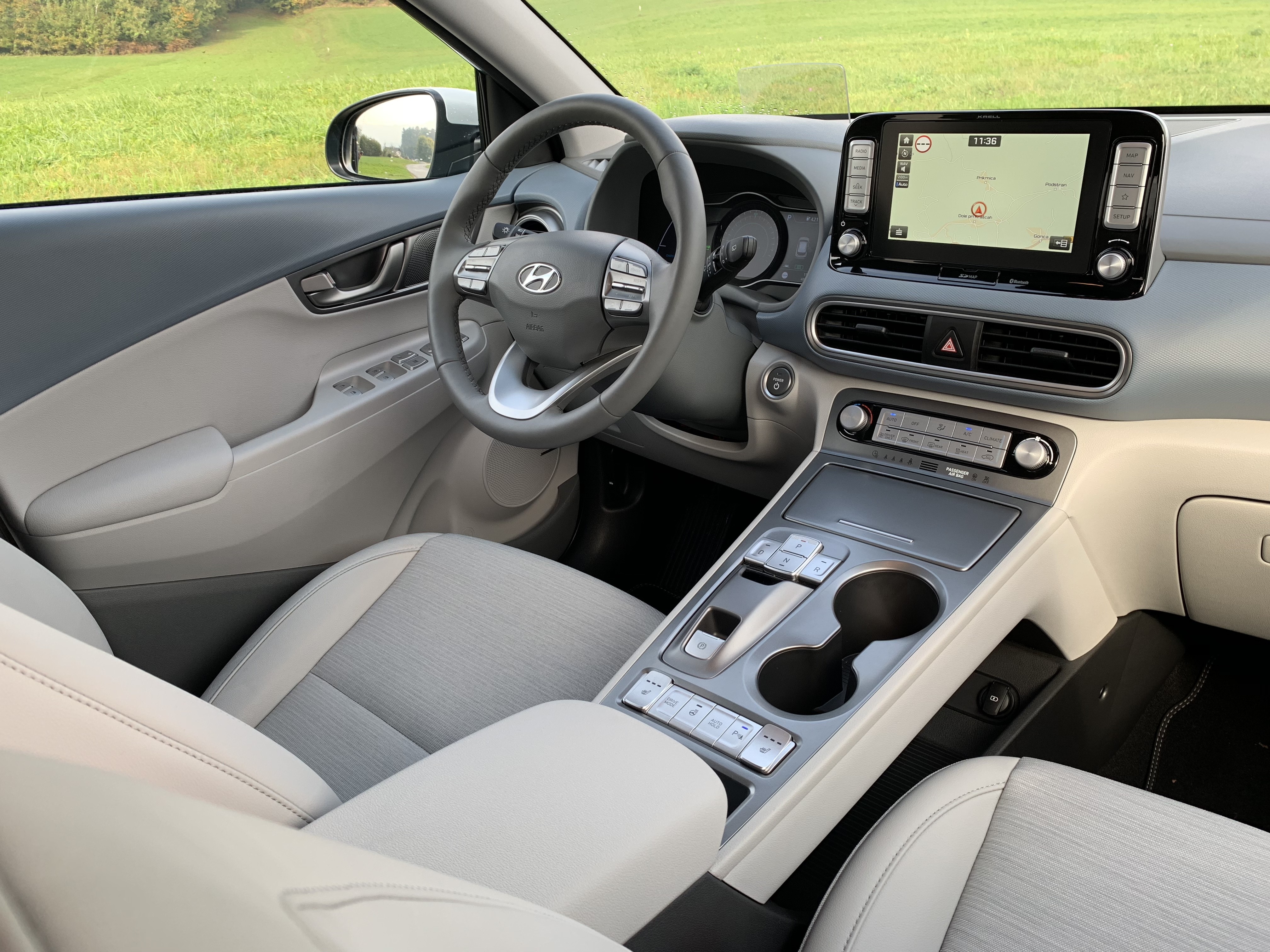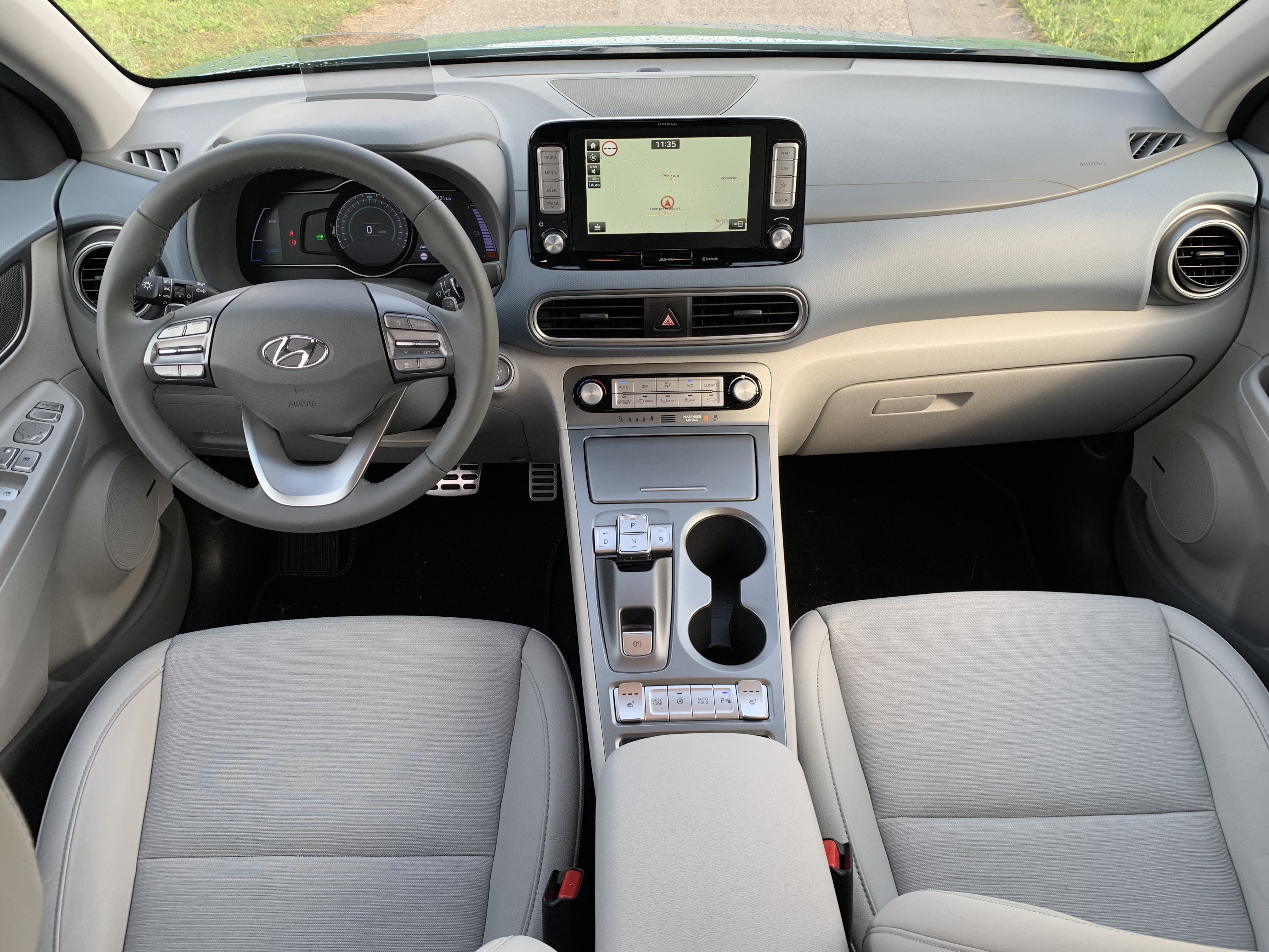 Der Innenraum bietet Neues 7- oder 8 Zoll Informationsanzeige u Projektionswand, das Informationen im Sichtfeld des Fahrers anzeigt. Obwohl der Innenraum auch dem Kona mit klassischem Motor sehr ähnlich ist, arbeitet er in einer elektrischen Version noch moderner und Sie können es sich in Schwarz oder einer dreifarbigen Kombination aus Grau und Blau vorstellen. Trotz der Batterie hat der elektrische Kona es zu bieten 322 Liter Gepäckraum, der auf vergrößert werden kann 1114 Liter.