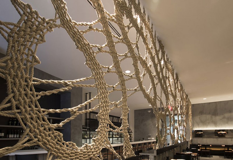 Ein neues wurde kürzlich in New York eröffnet Mediterranes Restaurant, deren mediterrane Atmosphäre genau betont wird Schirm aus Idrija-Spitze. Sie entwarf eine riesige Version eines traditionellen Handwerks Manca Ahlin, Architektin und Designerin mit slowenischen Wurzeln, die sich auch selbst um die Umsetzung gekümmert hat. Die Spitze dient als Trennwand, die den Speisesaal von der Bar trennt, und ist vor allem wegen ihrer Größe interessant. Statt aus zartem Seidenfaden wird er gewebt starke Seemannstaue und mit einhundertfünfzig Stahlklammern an den Wänden befestigt. Das Innendesign des Restaurants wurde von Archipelagos Architekten in Zusammenarbeit mit dem Studio A2 Interiors entworfen.