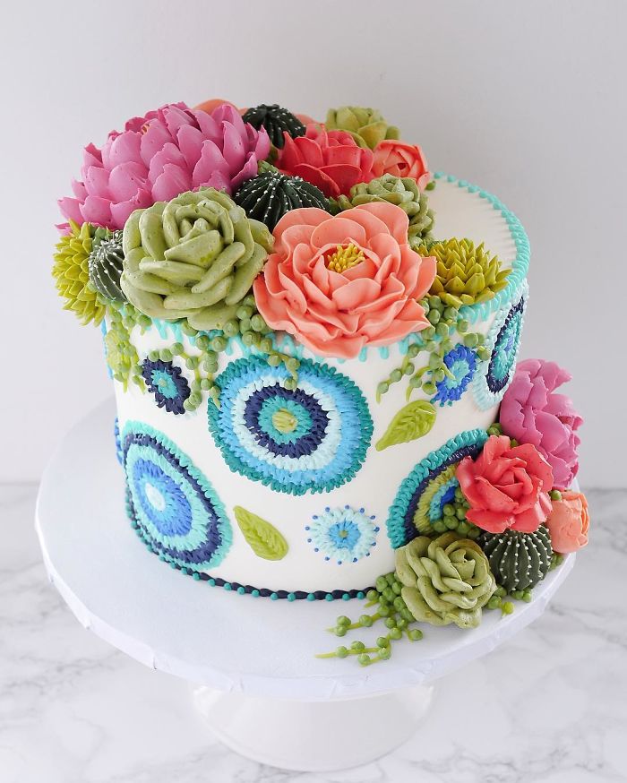 Leslie Vigil ist ein Konditormeister, der geschichtete Meisterwerke aus Desserts kreiert, darunter Waldtiere, Kakteen und sogar Kristallformationen. Ihre neueste Kuchenkollektion heißt Tapisserie, und für sie erlernte sie die Kunst des Stickens und schuf mit Hilfe von Stickereien "genähte" Blumen, die Kuchen schmücken. Es handelt sich also um eine Tapisserie-Dekoration, die an bestickte mexikanische Kleider erinnert, obwohl Leslie russische Stickereien und Frühlingsblumen als Inspiration nennt.