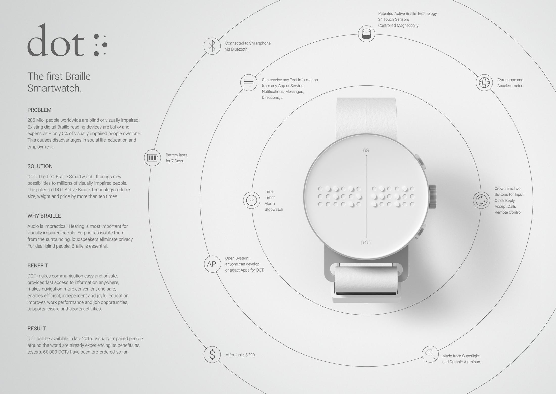 Es enthält vier dynamisch aktive Zellen, die ermöglichen Blindenschrift lesen, und der Benutzer wählt die Geschwindigkeit des Zeichenwechsels selbst aus. Die Uhr verbindet sich wie jede andere Smartwatch über einen Link mit dem Smartphone Bluetooth und "entschlüsselt" den Text einer beliebigen Anwendung oder Dienste (Messenger, Google Maps...).