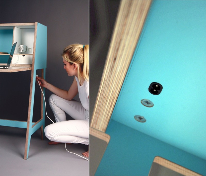 Auf den ersten Blick wirkt der minimalistisch gestaltete Arbeitstisch in schönem Mint-Farbton recht bescheiden. Tatsächlich denken wir beim Betrachten an ein Möbelstück, das eher zur Aufbewahrung als zu irgendetwas anderem geeignet wäre. Doch als sich die Tür des Wunderkabinetts öffnet, öffnet sich eine ganz andere Welt vor uns, ein äußerst spannendes Interieur.