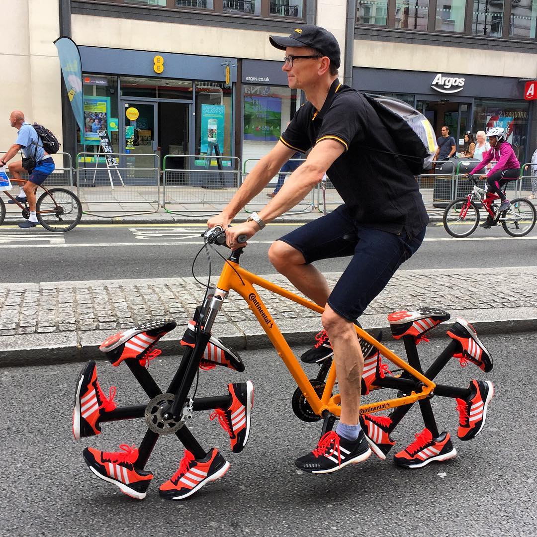 Beim Londoner Fahrradfestival RideLondon bot sich den Besuchern ein ungewöhnlicher Anblick. Ein Fahrrad, das Turnschuhe statt Reifen verwendet! Das Rad ist vom deutschen Reifenhersteller Continental signiert, der es Besuchern zum Testen zur Verfügung stellte.