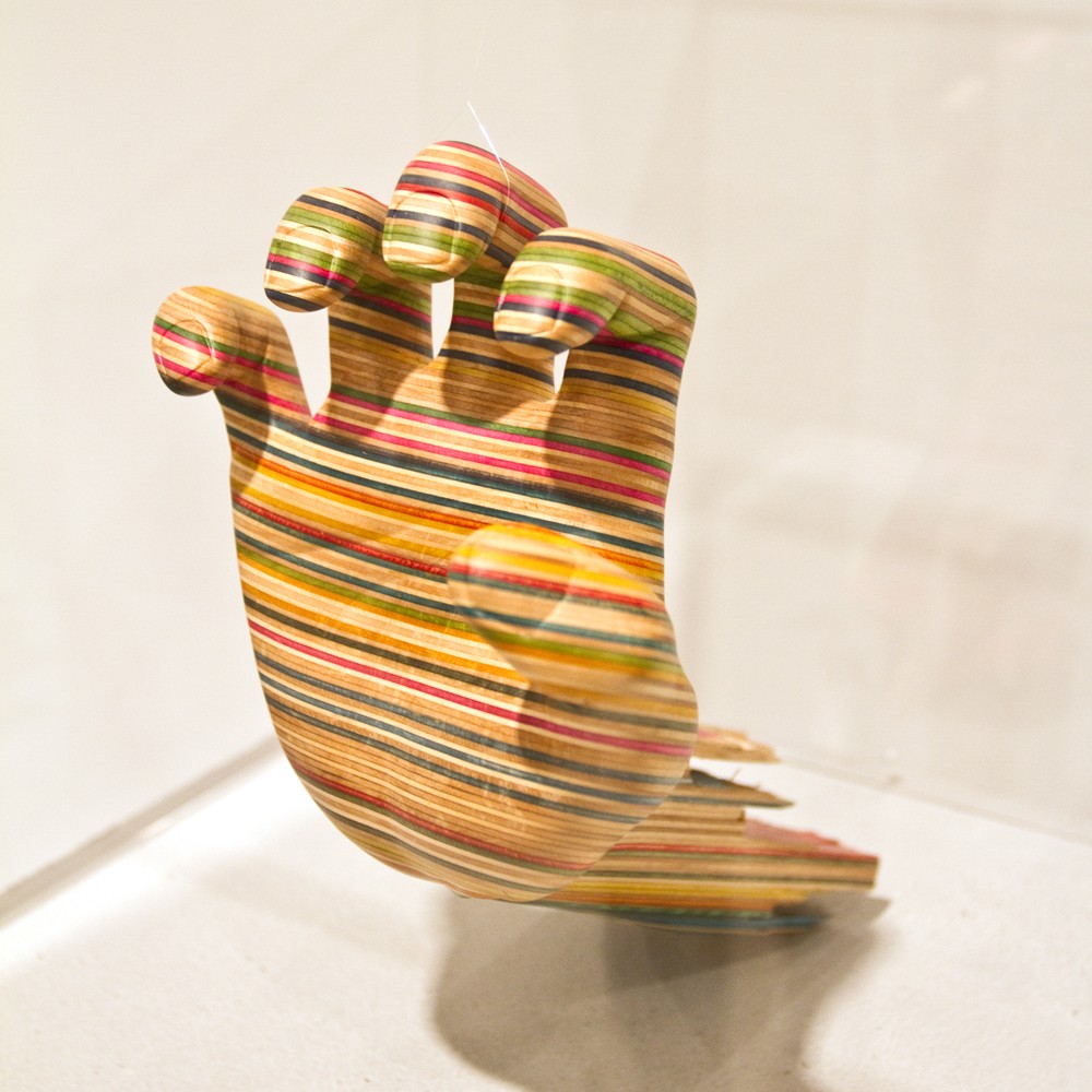 Es ist auf die Verwendung von alten hölzernen Skateboards zurückzuführen Haroshi erzielte das einzigartige Erscheinungsbild seiner Skulpturen, die aus mehreren Schichten Altholz bestehen. Diese Schichten sind unterschiedlich gefärbt, was den Skulpturen ein charakteristisches gestreiftes Aussehen verleiht. Wie er auf seiner Website schrieb, sind seine Kunstwerke die gleichen wie die Tafeln, die sein Leben darstellen. Sie sind ein Kommunikationsmittel zwischen ihm und der Außenwelt.