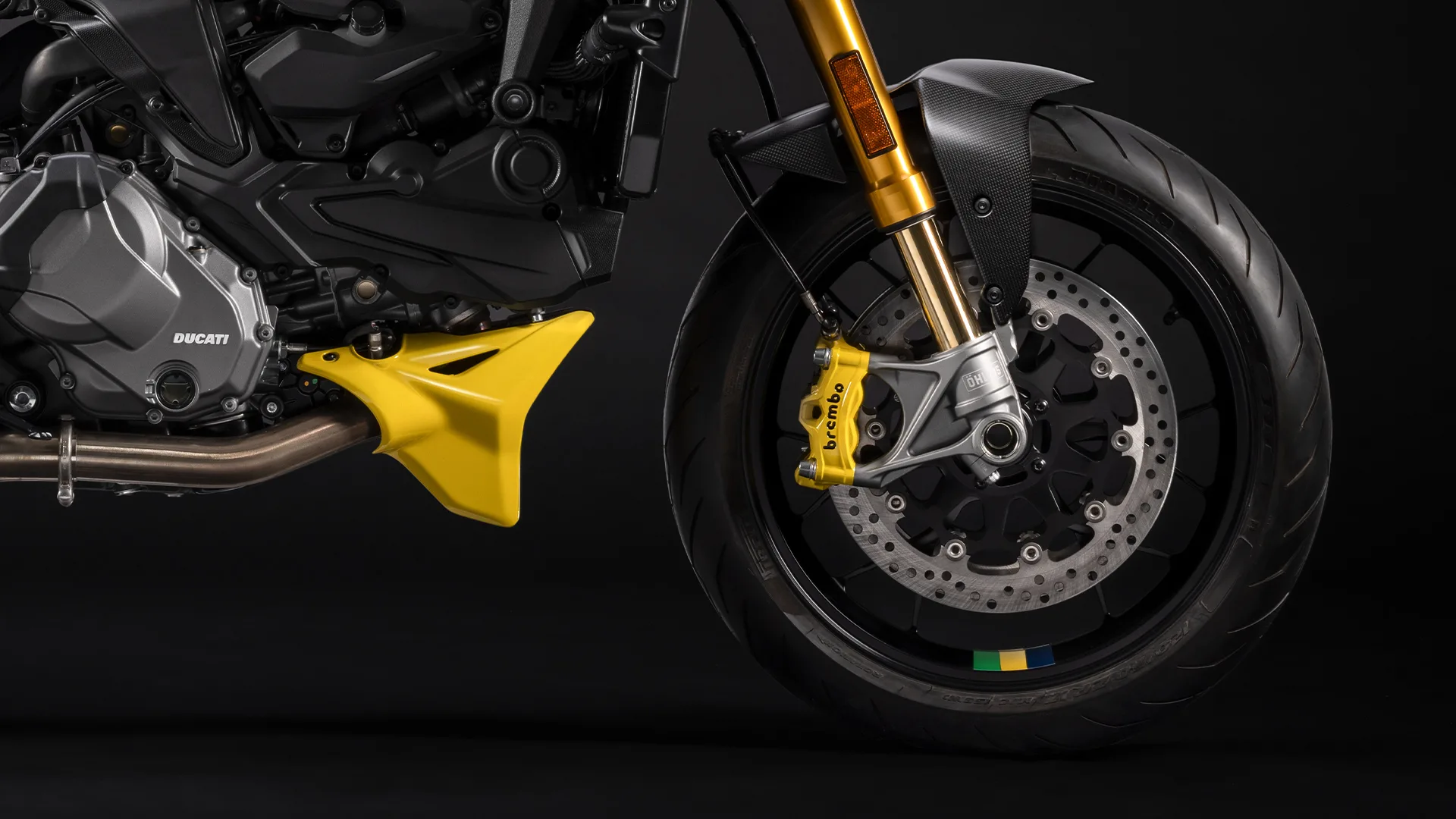 Das Motorrad ist außerdem mit der neuesten Technologie ausgestattet, um das Fahrerlebnis zu verbessern, einschließlich fortschrittlicher Bremsen, die ein zuverlässiges und effizientes Anhalten gewährleisten. Die gelben Brembo-Bremssättel spiegeln die Exzellenz und Präzision wider, die Ducati in jede Komponente einbringt.