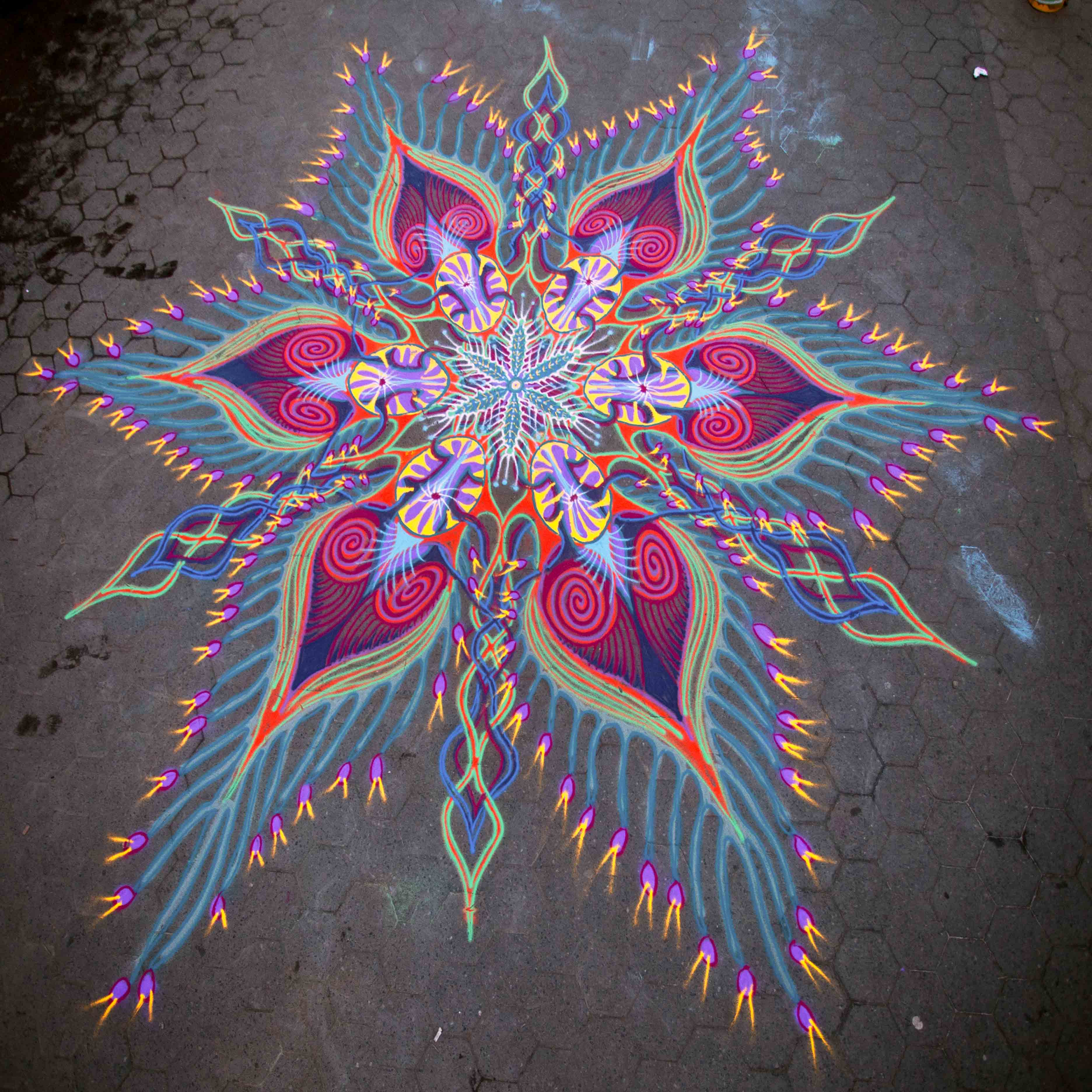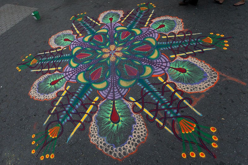 Bewaffnet mit Säcken aus farbigem Sand Joe Mangrum Er ist in den letzten Jahren durch die Straßen der Stadt gelaufen und hat damit erstaunliche Muster geschaffen. Jedes seiner Kunstwerke ist völlig spontan und entsteht in einem Moment der Inspiration. Es dauert zwischen sechs und acht Stunden, ansonsten schätzt der Künstler, dass er bisher rund 550 davon geschaffen hat.