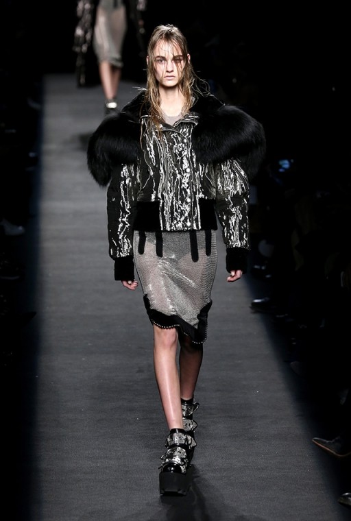 Alexander Wang ist Schwarz treu, wie seine neueste Kollektion zeigt, die überwiegend aus schwarzen Modestücken besteht. Er durchbrach hier und da den schwarzen Faden der Kollektion mit einem weißen Pullover, gewaschenen Jeans, rotem Karo und Metallic-Mesh. Die Models liefen mit starkem Make-up und rockig zerzausten Haaren über den Laufsteg. Tragbar, modisch, funktional und ganz „Alexander Wang“.