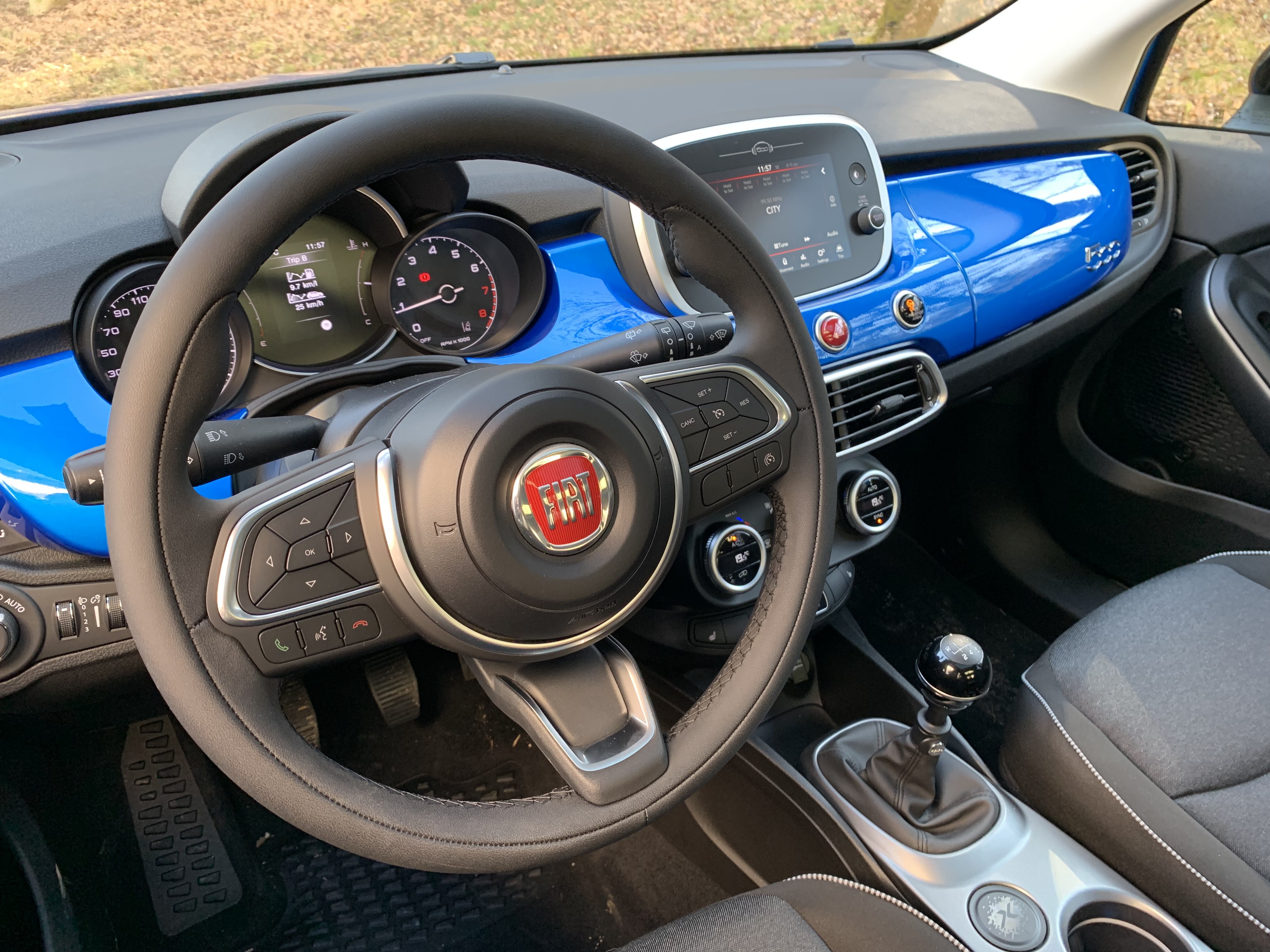 Renovierter Innenraum des Autos Fiat 500X bietet ein neues Lenkrad an Felge, neue Messgeräte, neue Instrumententafel, aktualisierte Grafiken und das Uconnect-System der neuesten Generation.