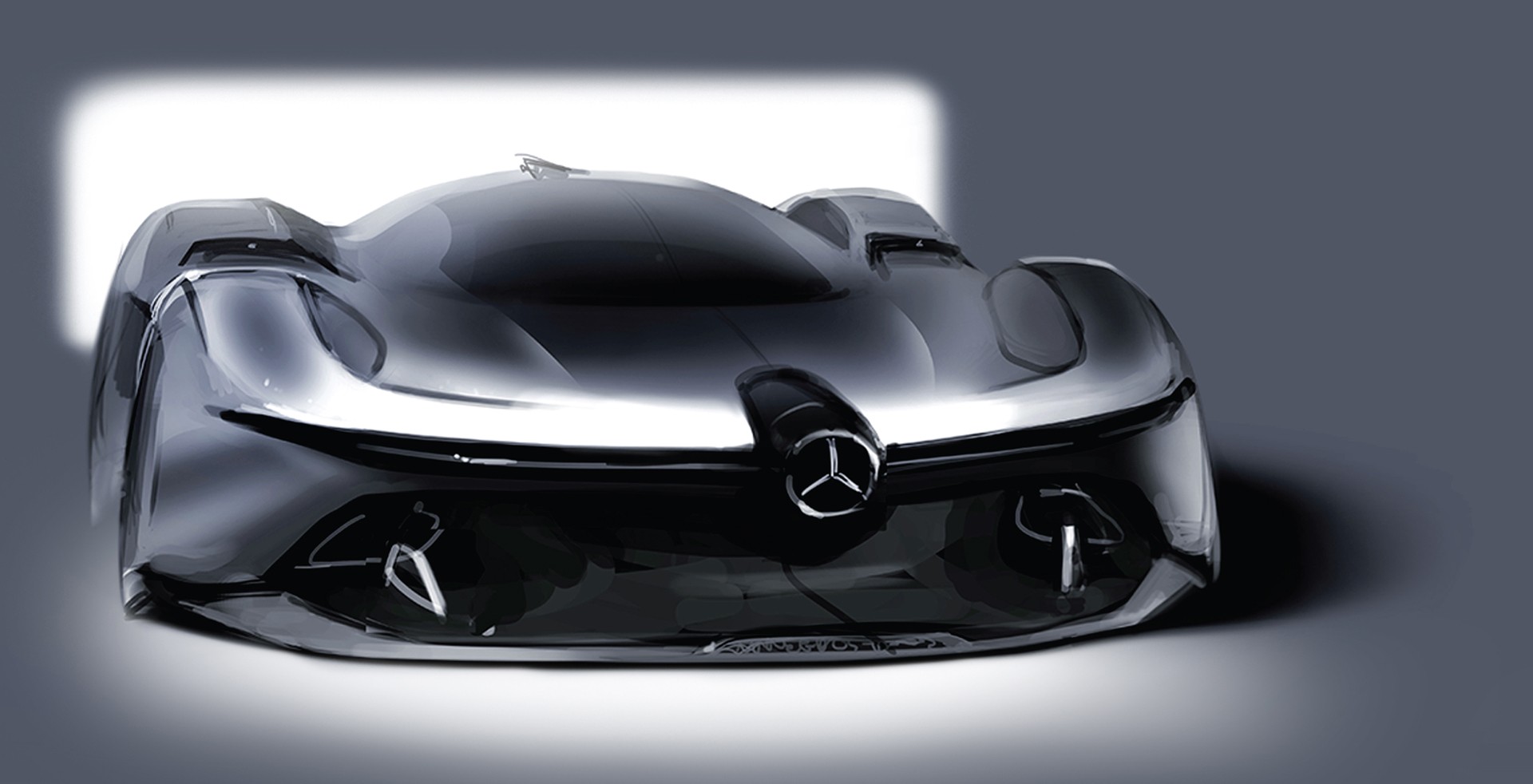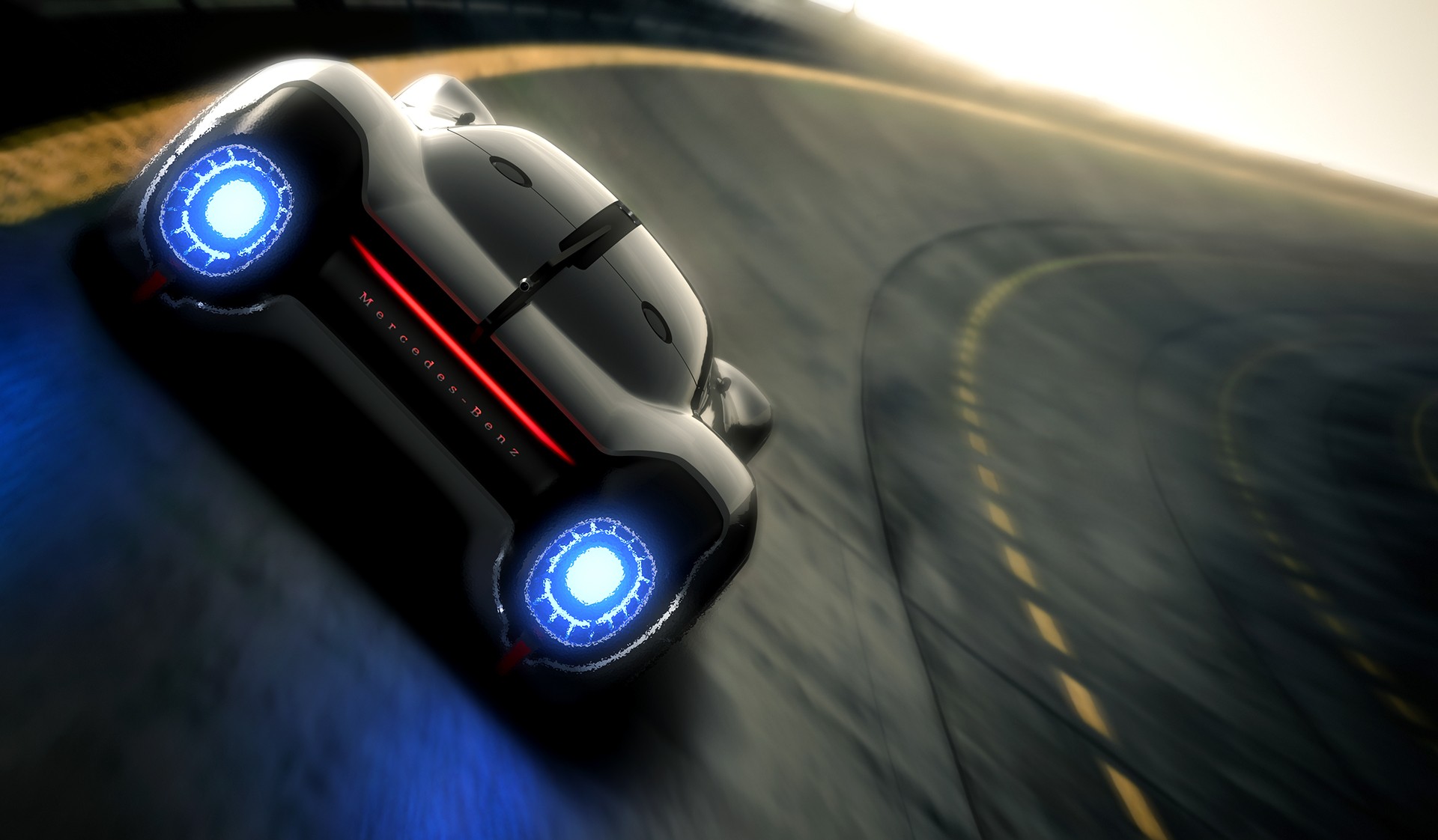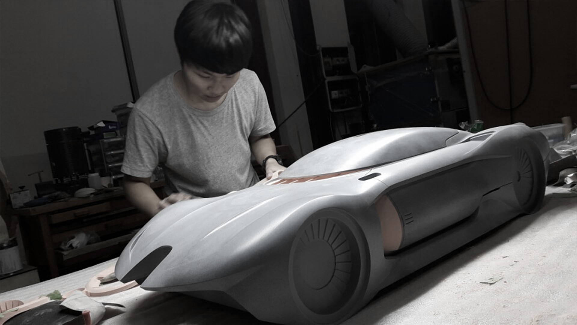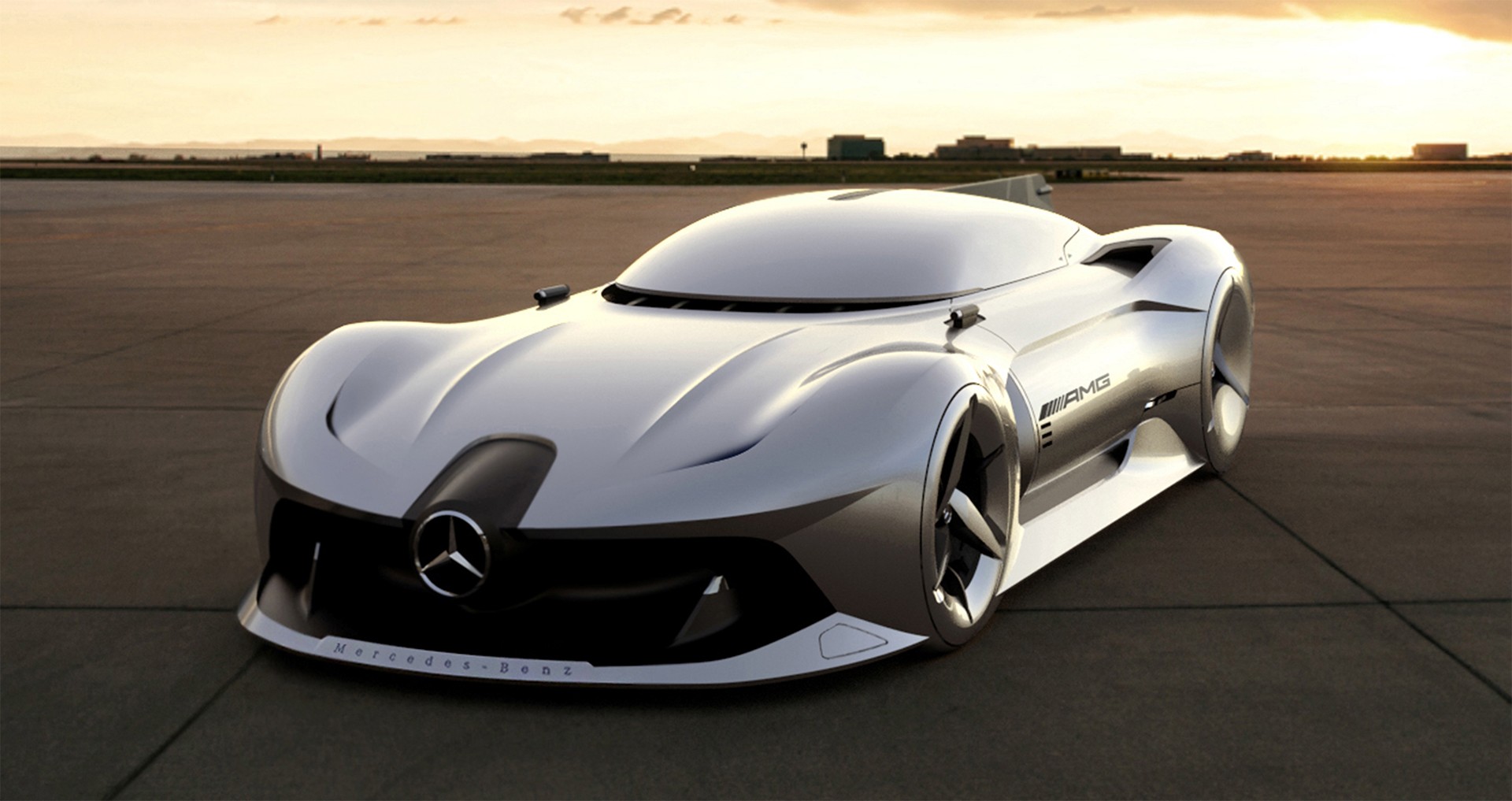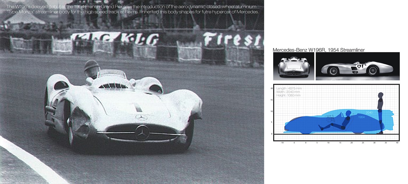 Er unterschreibt darunter Minwoong Im, in dem behauptet wird, dass der Mercedes-Benz 2040 W196R Streamliner dies tun würde des Strahlantriebs brach problemlos alle Geschwindigkeitsrekorde. Obwohl es teilweise den Linien eines Rennwagens aus den Fünfzigern folgt, finden wir mehr Ähnlichkeiten mit einem Überschallflugzeug als alte Formel-1-Autos.