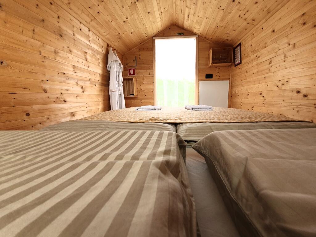 Holzhäuser drin Glamping Green Resort, die zwischen den Weizenfeldern platziert sind, ähneln alte Holzmühlen am Wasser, die einst an der Drau operierte. Sie sind vollständig aus Holz gefertigt und vermitteln ein Gefühl von Wärme und Behaglichkeit. Runde Fenster und Glastüren, die sich zur Natur öffnen, sorgen für Romantik. Und damit ist die Installation definitiv etwas Besonderes. Sie können in klimatisierten Häusern schlafen 4 Leute, da das Haus im unteren Teil über ein Doppelbett und im Obergeschoss über ein Zusatzbett für 2 Personen verfügt. Du kannst es dir leisten leckeres Frühstück, das auf der Terrasse des Wasserparks serviert wird.