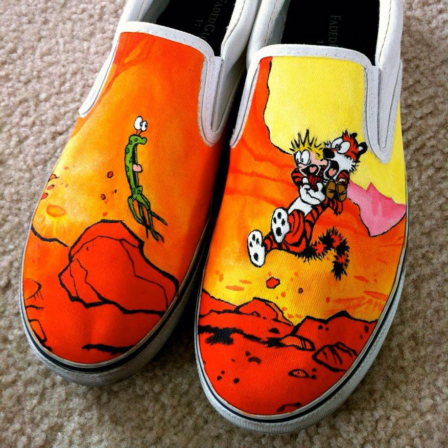 Wir alle möchten wahrscheinlich ein paar einzigartige Stücke in unserem Kleiderschrank haben. Laces Out Studios, der seine Kreationen über das soziale Netzwerk zur Ansicht anbietet Facebook, kreiert maßgeschneiderte Schuhe basierend auf den beliebtesten Pop-Ikonen der letzten zwei Jahrhunderte, wie zum Beispiel: Die Beatles, Pink Floyd, Robin Hood, Disney und Calvin & Hobbes. Mithilfe von wasserfesten Farben oder Textilfarben und viel Kreativität verwandeln sie einfache weiße Schuhe in erstaunliche und detaillierte individuelle Kreationen. Die Idee wurde schnell von Straßenhändlern aufgegriffen, aber natürlich kann man auch online ein Paar handgezeichnete Schuhe kaufen.