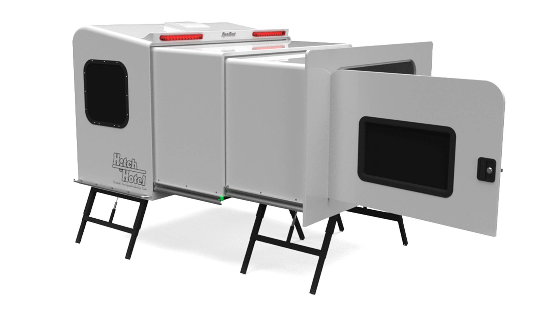 Hitch-Hotel ist der weltweit erste erweiterbare Wohnwagen ohne Räder. Das bedeutet, dass Sie ihn nicht hinter sich herziehen müssen und somit nicht von all den zusätzlichen Straßen- und Verkehrsregeln abhängig sind, die das Abschleppen eines Wohnwagens betreffen. Während der Fahrt, wenn der Anhänger geschlossen ist, kann das Hitch Hotel genutzt werden Ladungsspeicher, wie wir zur Verfügung haben 1,7 Kubikmeter Volumen, das reicht für drei Räder. Die Konstruktion ist wasserdicht, sodass Sie sich keine Gedanken darüber machen müssen, ob Ihre Sachen trocken am Zielort ankommen.