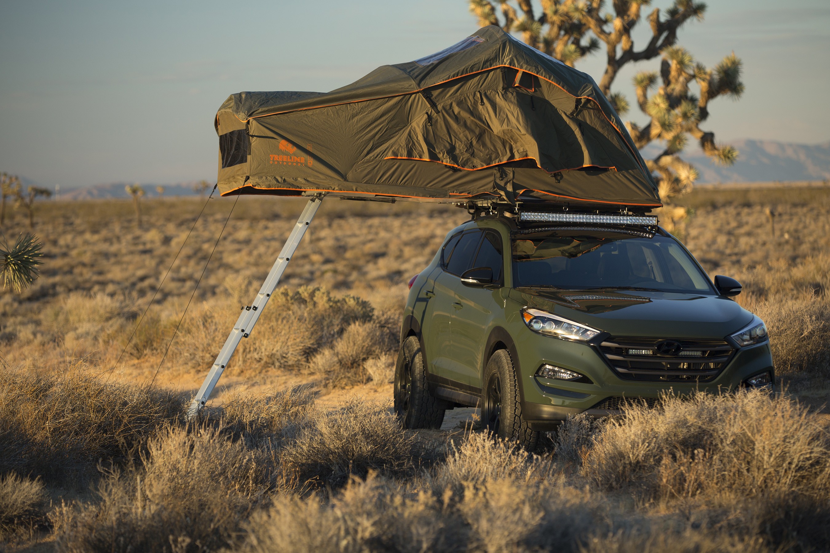 Hyundai Tucson-Abenteuermobil es ist Fluchtauto. Ein Auto, um dem Betondschungel zu entfliehen, dem Trubel der Stadt, wo das Hupen durch Vogelgezwitscher oder ohrenbetäubende Stille ersetzt wird. Auf dem Dach des SUV finden sich militärgrüne Farben Autozelt (Tamarack Constellation Gen2), das zwei Schlafplätze bietet und prahlt mit Sonnenkollektoren (Goal Zero Nomad 20) und Batterie (Yeti 400), der dafür sorgt, dass mobile Geräte am Leben bleiben und wir mit der modernen Lebensweise nicht die Nabelschnur durchtrennen.