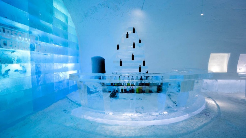 16 einzigartige und berühmte Hotelsuiten zu entwerfen Eis Bar des schwedischen Pop-up-Hotels Eishotel Jährlich werden 1.600 Tonnen Schnee benötigt, die angehende Künstler und erfahrene Eisdesigner in ein einzigartiges Eismärchen im Stil des Animationsfilms Frozen verwandeln. Künstlerinnen und Künstler aus aller Welt bewerben sich jedes Jahr eifrig um die Ehrenausschreibung für Designer exklusiver Hotelzimmer.