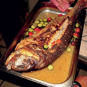 Zutaten für zwei Personen: 800 - 1000 g Wolfsbarsch oder Dorade 2 Esslöffel Meersalz 1 dl Olivenöl 2 dl Weißwein 2 Tassen Fischfond 2 Porree 2 Zucchini 4 Kartoffeln Zubereitung: Den Fisch quer über den Bauch schneiden und Innen gründlich reinigen und unter fließendem Wasser abspülen...