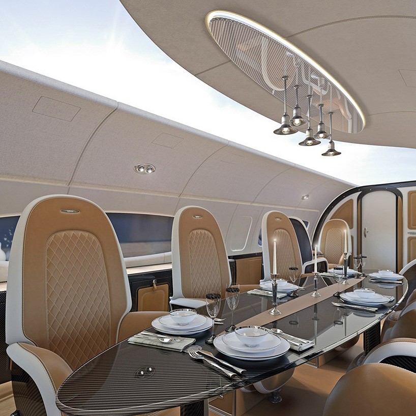 Flugzeugkabine Airbus erinnert an Innenraum von Pagani-Autos, da gibt es Teppiche aus weiches Leder und Kohlefaser- und Holzmöbel. Der Raum ist in mehrere Teile unterteilt bzw Ecken, ab Kinoraum, zu Esszimmer und Salon. Um den Atem zu behalten, wurde die Decke mit ausgestattet riesiger Bildschirm, auf dem Sie zuschauen können Himmel. Das soll es sein 8 Passagiere, als das Flugzeug sie empfängt, verzaubert ein Gefühl der Offenheit. Neue Airbus bietet bis zu 15 Stunden Freuden in der Luft, und es gibt wahrscheinlich keinen Helden unter uns, der sie nicht so verbringen möchte.