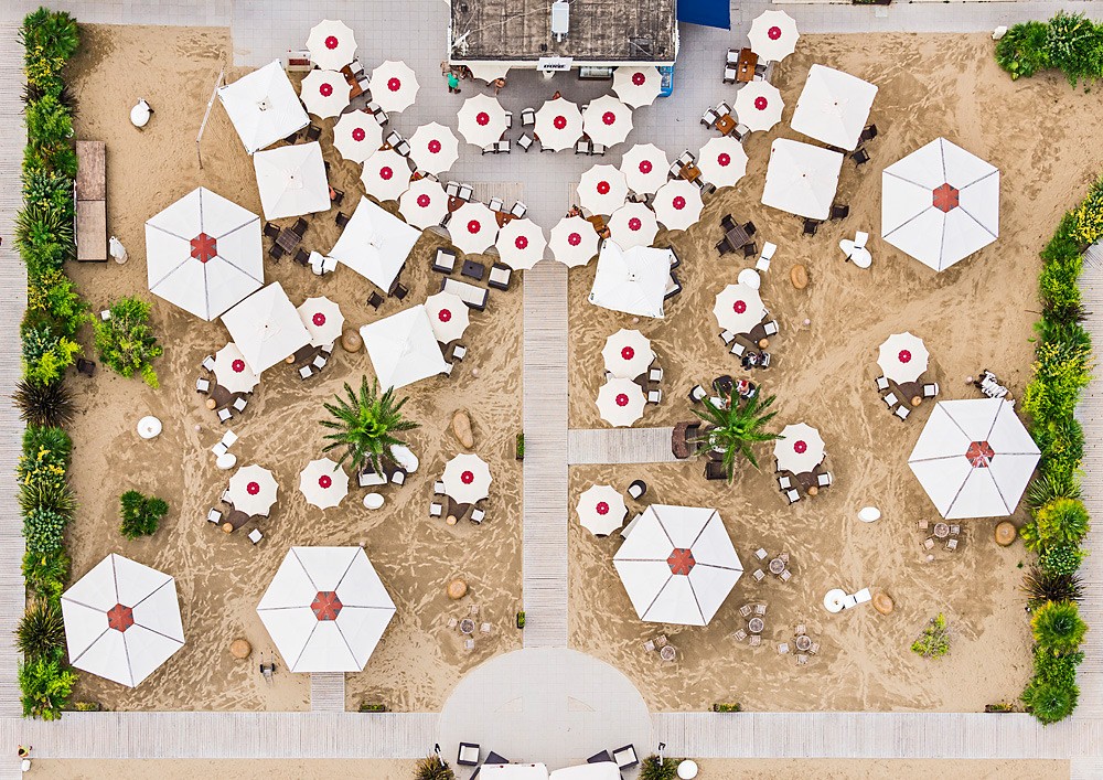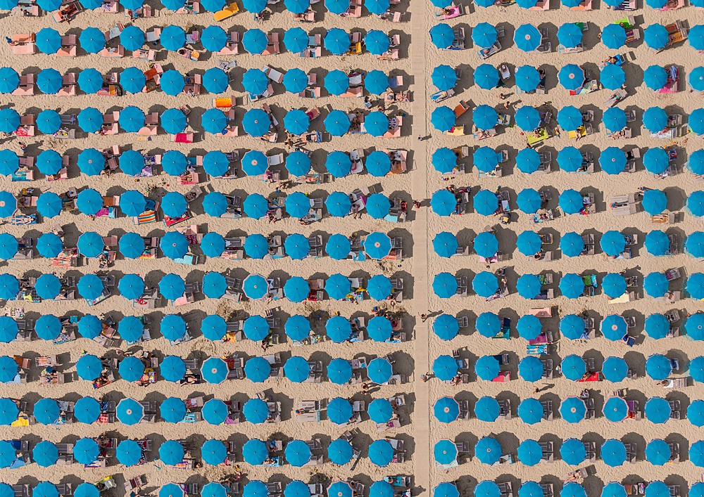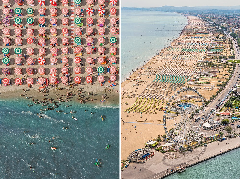 Deutscher Fotograf Bernhard Lang er lebt und arbeitet in München, sein "Spezialgebiet" ist die Luftbildfotografie. Bisher fotografierte er hauptsächlich die deutsche Landschaft aus der Luft: Bergwerke, Siedlungen und industrielle Teile Deutschlands. Aber er hat sie vor Jahren besucht Ferienort Adria in Italien. Dort war er beeindruckt von der Platzierung bunter Sonnenschirme an den Stränden, die überall in geraden Reihen angeordnet sind. Die Szene ließ ihm offensichtlich keine Ruhe, denn er kehrte dieses Jahr zurück – nur mit einem Flugzeug, von dem aus er mehrere Stunden damit verbrachte, die Küste zwischen den Städten Rimini und Ravena zu fotografieren.