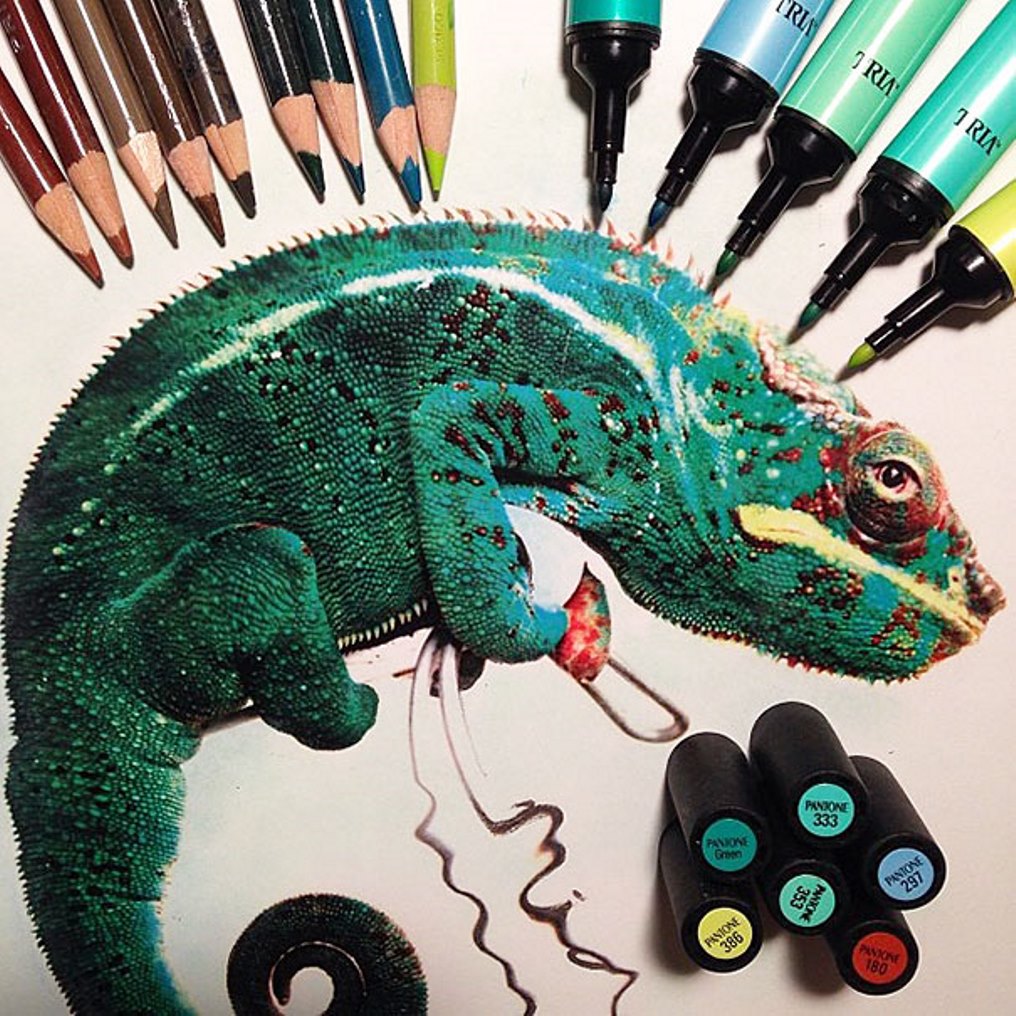 Einige Zeichnungen stammen von ihr mehr Arbeitsstunden, andere sogar einige Tage, denn die talentierte junge Frau achtet auf jeden Farbton und jeden winzigen Schatten, damit das Produkt am Ende wie ein Top-Foto aussieht. Aber als sie das fertige Produkt auf ihrem Instagram veröffentlichte, beschloss sie, auch ein Foto von ihren Buntstiften und Pantone-Filzstiften zu machen, weil die Leute es immer noch nicht glauben können sehr realistische Zeichnungen und nicht für Tierfotos. Jede Zeichnung skizziert er zunächst mit Bleistift und entscheidet dann, mit welchen Werkzeugen er den gewünschten Effekt erzielt. Dafür verwendet er Buntstifte, Pantone-Marker und Acrylfarben ein hervorragendes Ergebnis und wunderbar satte Farben.