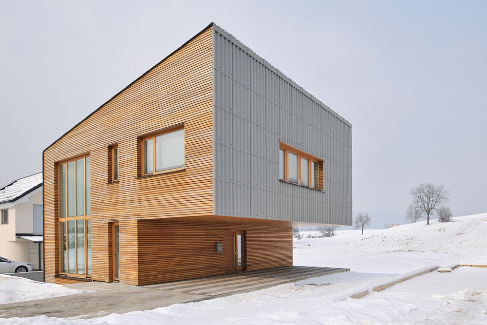 Die Privatsphäre der Räumlichkeiten des Gebäudes nimmt mit den Stockwerken zu; im untergeschoss befinden sich das büro des vaters und das kinderspielzimmer, das erdgeschoss ist für wohnräume und das erste obergeschoss für schlafzimmer vorgesehen. Konstruktiv ist das Gebäude in einer Kombination aus Stahlbeton und Holz ausgeführt. Neben der Schnelligkeit und Leichtigkeit des Bauens wurde die Entscheidung für eine Holzkonstruktion auch durch den Wunsch nach nachhaltigem Bauen unterstützt. Wie wir wissen, ist Slowenien sehr reich an Holz, und gleichzeitig ist der Aufenthalt in einem Holzgebäude äußerst angenehm. Die Nord- und Südfassaden sind mit Holz verkleidet und öffnen sich mit großen Fenstern zur wunderschönen Landschaft. Andererseits sind aufgrund der Nähe zu den Nachbargebäuden die Ost- und Westfassade weitestgehend geschlossen und mit Wellzementplatten gedeckt, mit denen auch das Dach gedeckt ist.