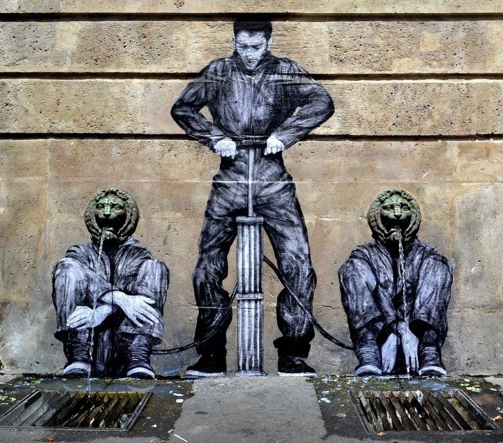 Karl Leval oder Weste ist ein französischer Künstler, der verwandelt Straßenobjekte in Meisterwerke, in der sie gefangen sind Absurdität und Humor. Mauern, Straßen, Bürgersteige und andere gewöhnliche Objekte französische Straßen in satirische Kunstwerke verwandeln, die seine ausdrücken Sicht der Welt und sie zeigen die harte Wahrheit des modernen Lebens.