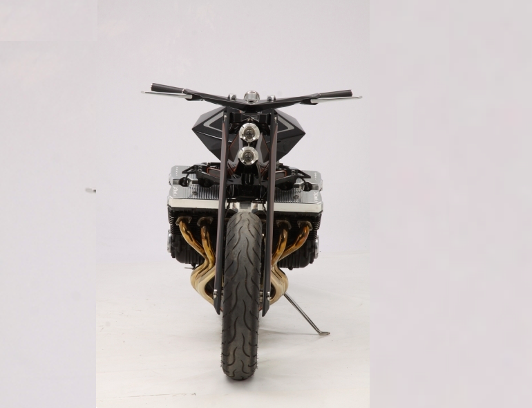 Die Abgasanlage besteht aus über 6 Meter Rohren aus rostfreier Stahl. Auch einzigartig und komplett Es ist ein futuristischer Behälter für Kraftstoff, die voller scharfer Linien ist. Der Sitz bzw. das Stück Leder dient eher der Ästhetik als dem Fahrkomfort. Es ist wahr, dass man bei einzigartig gestalteten Motorrädern die Nützlichkeit vergessen muss, denn das ist der Fall Design und Vision gehen immer vor Praktikabilität.