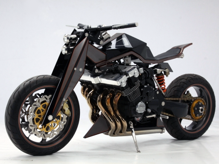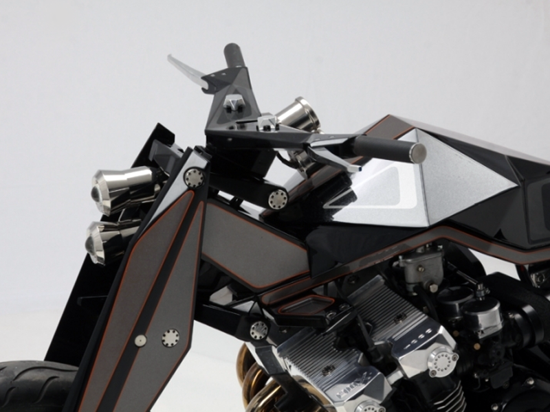Die Abgasanlage besteht aus über 6 Meter Rohren aus rostfreier Stahl. Auch einzigartig und komplett Es ist ein futuristischer Behälter für Kraftstoff, die voller scharfer Linien ist. Der Sitz bzw. das Stück Leder dient eher der Ästhetik als dem Fahrkomfort. Es ist wahr, dass man bei einzigartig gestalteten Motorrädern die Nützlichkeit vergessen muss, denn das ist der Fall Design und Vision gehen immer vor Praktikabilität.