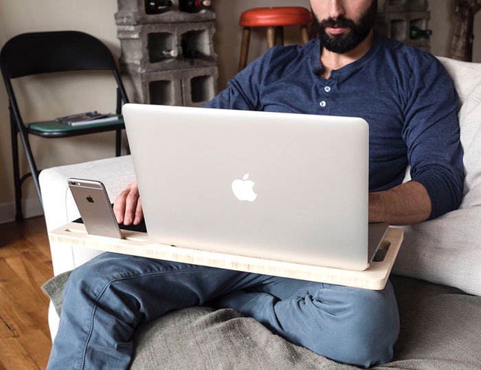 Das LapPad bietet Platz für 17-Zoll-Laptop, zwei Smartphones und Tablets, aber wir dürfen auch das Mauspad nicht vergessen. Es ist hergestellt aus Bambus, der die Wärme der Geräte aufnimmt, und mit seinem Design bringen wir auch Ordnung in alle möglichen Verkabelungen. Es ist extrem leicht und langlebig und somit ein unverzichtbares Arbeitsgerät.