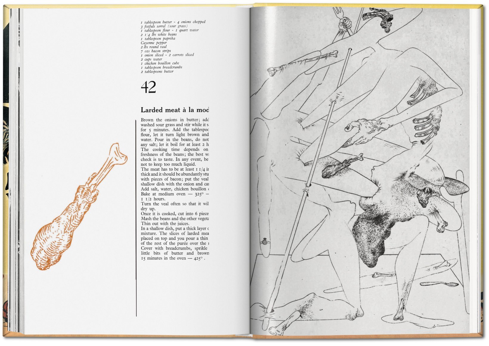 Das skurrile Kochbuch, nach 40 Jahren vom renommierten Taschen-Verlag neu aufgelegt, steckt voller skurriler Illustrationen und inspirierter Rezepte rauschende und extravagante Partys Dalí und seiner Frau Gale, auf denen oft Gäste getragen wurden Kostüme, und ging frei zwischen ihnen umher Tierwelt.