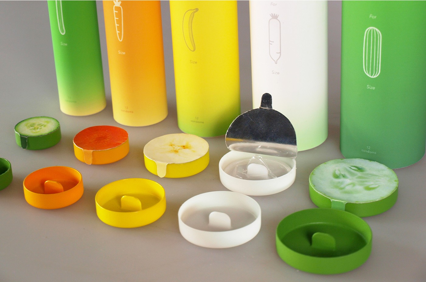 Taiwanesischer Student, Guan-Hao Pan, von der National Taipei University of Technology, beschloss, Männern die Wahl eines Kondoms zu erleichtern. Das tat er Verpackungen, die mit Obst- und Gemüsesymbolen gekennzeichnet sind, einschließlich Karotte, Gurke, Banane, Rübe und Zucchini.