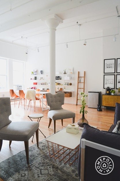 Ihr Designer hat einen leeren Industrieraum mit hohen Decken meisterhaft in eine feminine, angenehme Arbeitsumgebung verwandelt, die die Ästhetik modischer weiblicher Angestellter widerspiegelt. Modeaccessoires, Bücher und Blumen sind in den Regalen ästhetisch arrangiert, die Gäste können bequem auf dem Sofa sitzen und durch die Fenster fällt angenehmes Licht in den Raum. Der Konferenztisch ist von mit Schafsfellen gepolsterten Kupferstühlen umgeben, und über der Minibar hängen Grafiken von New Yorker Restaurants. Das Ergebnis ist ein wirklich perfektes Arbeitsumfeld für junge Trendsetter, die damit noch leichter die Welt erobern!