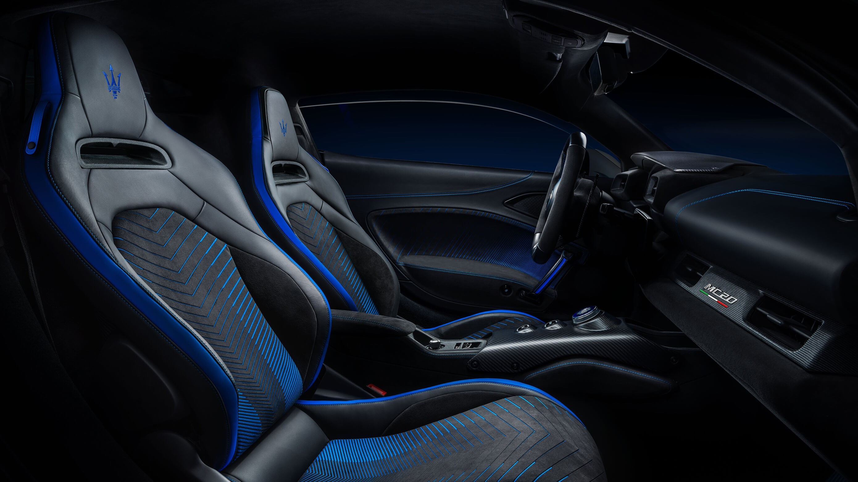 Sein Innenraum, in dem zwei Sitze zur Verfügung stehen, ist mit edlem Leder bezogen und wird durch zwei digitale Bildschirme ergänzt. Trotzdem hat es minimalistisch poliert MC20, das Sie durch die Heckklappe betreten, alle wichtigen Tasten direkt am Lenkrad.