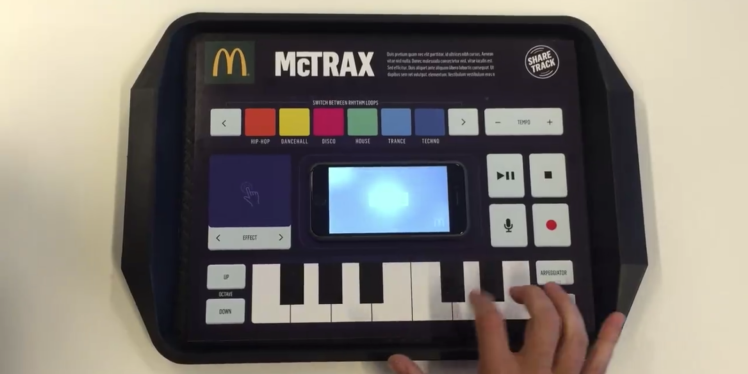 Tischset McTrax Es besteht grundsätzlich aus Papier (wie alle normalen), beim Drucken wurde jedoch ein Motiv verwendet leitfähige Tinte, das über einen Link die Verbindung mit einem Smartphone ermöglicht Bluetooth, mit deren Hilfe die Tischdecke „zum Leben erwacht“, denn jeder Schaltflächen und Tasten werden aktiv. Alles, was Sie tun müssen, ist herunterzuladen McDonalds-App (verfügbar für iOS und Android), legen Sie Ihr Telefon auf das Tischset und schon können Sie mit der Nutzung von Samples, Tastatur, Mikrofon, Aufnahmegerät usw. beginnen.