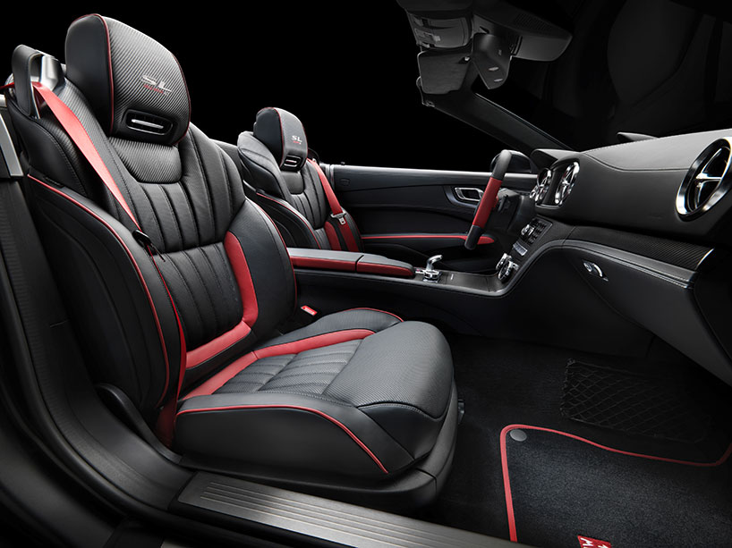 Das Modell wird erstmals vorgestellt im Salon in Genf, wenn neben dem fertigen Außenbild auch der sorgfältig gestaltete Innenraum, der ebenfalls von einem schwarz-roten Motiv geprägt sein wird, seinen Blick erfreuen kann. Diese werden an den Sitzen, Türverkleidungen, Fußmatten und auch am Lenkrad ausgetauscht Sicherheitsgurt gekleidet in leuchtend rote Farbe. Zum Thema Sport AMG-Sitze aber auch die Inschrift wird gedeihen SL Mille Miglia, Das lässt den Betrachter wissen, dass er vor einem seltenen Beispiel eines modernen Roadsters mit einem dreizackigen Stern auf der Nase steht.
