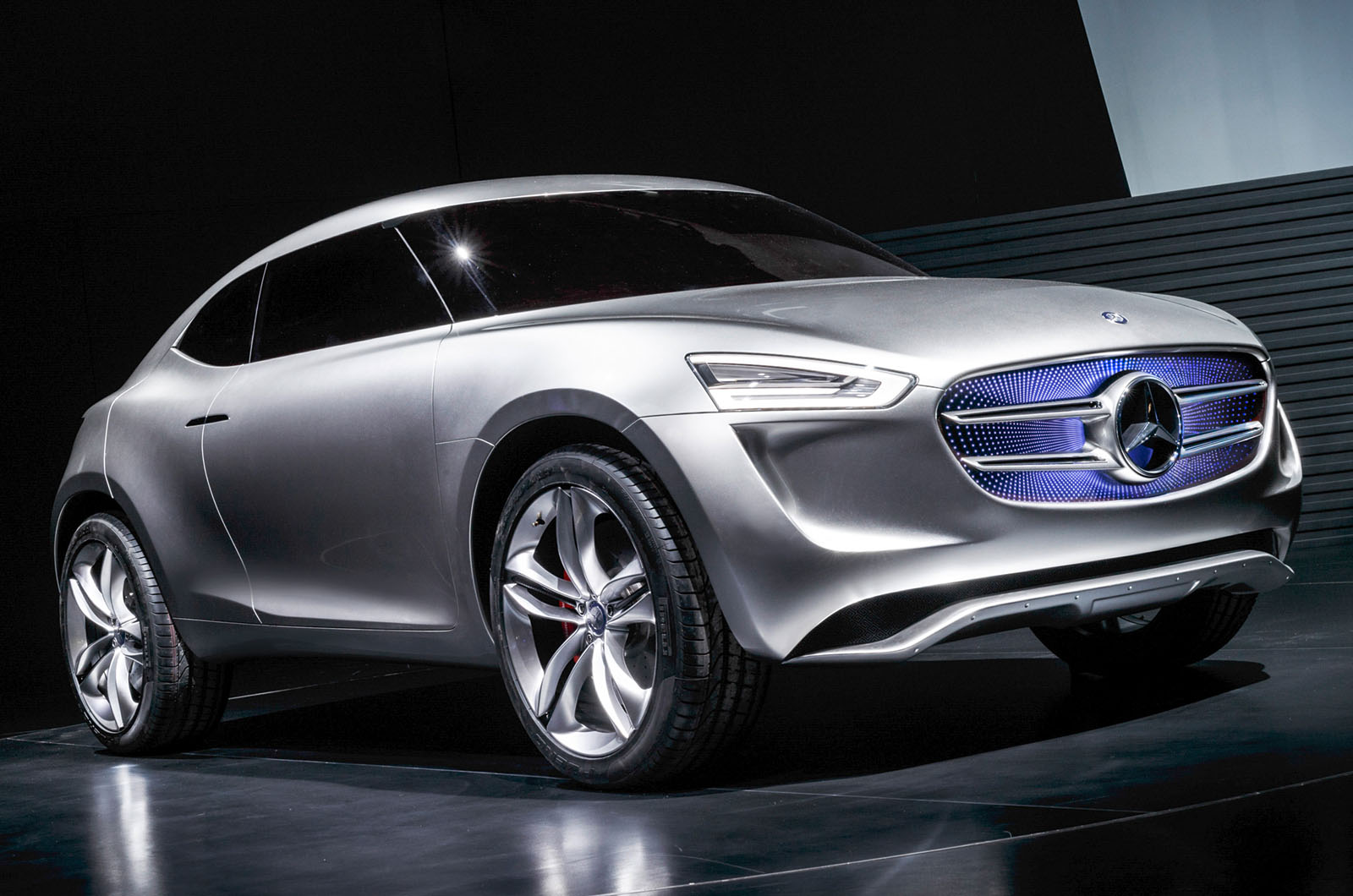 Die Farbe hat er vom kürzlich vorgestellten Mercedes-Supertruck geerbt, der komplett selbstständig fahren kann Frontmaske wechseln, die mit Hilfe vieler Leuchtdioden zeigt an Zu welchem Laufwerk fährt G-Code im Moment tatsächlich? Wenn das Auto vor der Ampel steht, blinkt die blaue Farbe ruhig, wenn es in Bewegung ist, bildet die Matrix eine blaue Tunnelform, und wenn der Hauptmotor angeschlossen ist, wird der gesamte vordere Teil rot.