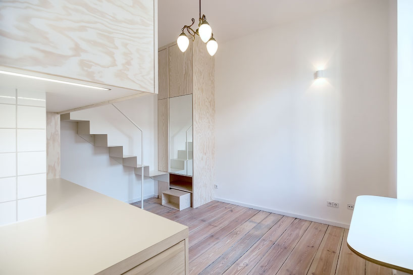 Architekten des Berliner Architekturbüros Spamroom und Architekt John Paul beeindruckt mit einer großartigen Renovierung 21 Quadratmeter eines großen Mikro-Apartments, das aus einer langen Zeit stammt 1900. Die Wohnung, die war gründlich renovierungsbedürftig, bietet heute alles, was ein moderner Mensch im Alltag braucht. Eine Wohnung, die zuvor kein Badezimmer hatte, da die Eigentümer das Badezimmer mit den anderen teilten Bewohner des Gebäudes, nach der Renovierung gewann es diese hinzu, und mit der fantasievollen Neuanordnung von Trennwänden und Küchenelementen wurde das Mikro-Apartment zu einem luftigen und komfortablen Wohnort, der auch mit der Dekoration im „Jugendstil“-Stil immer noch beeindruckt.