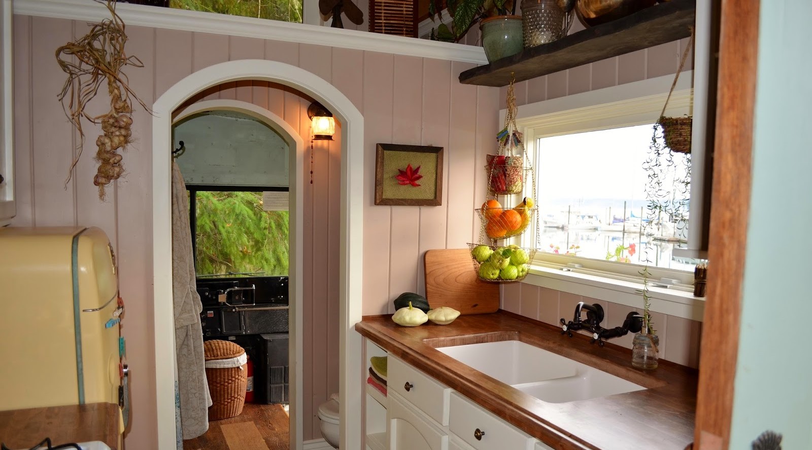 Lastnik tega malega doma je star šolski avtobus spremenil v očarljivo bivališče. Lesene obloge se vzpenjajo do ukrivljenega stropa, medtem ko vgrajeno ležišče ponuja dva prostora – bivalno-dnevni in spalni prostor.