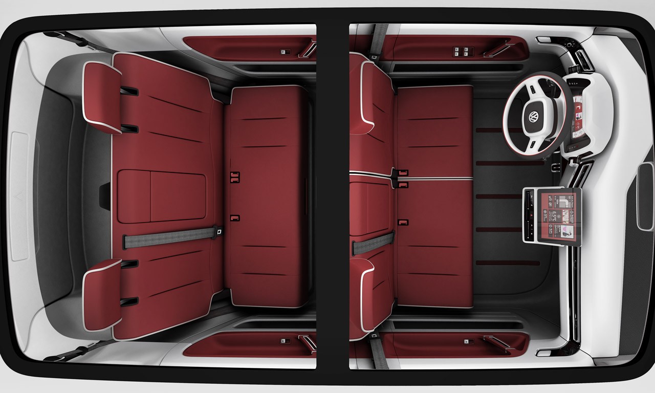 Der Innenraum ist minimalistisch, mit nur einem Tachometer und einem großen Bildschirm in der Mitte des Armaturenbretts, vorderen und hinteren Klappbänken, die in ein Notfallbett umgewandelt werden können. Die Chefdesigner Walter DeSilva, Geoup und Klaus Bischoff sorgten dafür, dass der neue Look die Hauptmerkmale des legendären Minibusses beibehält – eine große Box mit glatten Linien, ein riesiges Volkswagen-Logo auf der Vorderseite, eine leicht gebogene Windschutzscheibe und klassische Türen anstelle von Flügelschiebern Türen.
