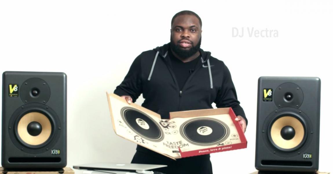 Sie können es oben ansehen Demonstration ein echter DJ, der Musik auf einer Pizzaschachtel spielt.