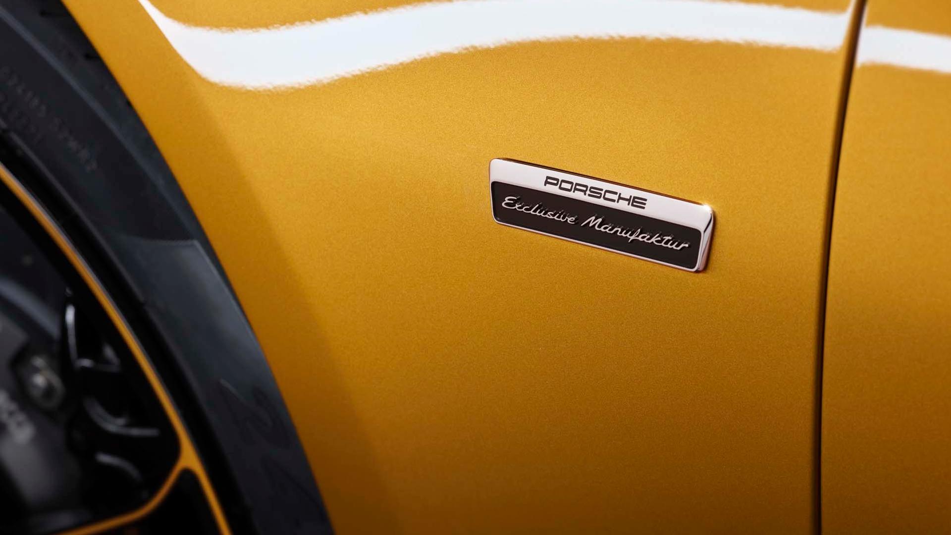Am auffälligsten ist natürlich die goldgelbe Metallic-Farbe. Dieser ist exklusiv für Porsche 911 Turbo S Exklusiv, aber wenn Ihnen das immer noch zu viel ist, stehen Ihnen auch andere, weniger auffällige Farben zur Verfügung. Alles wird durch einen Carbonstreifen in der Fahrzeugmitte aufgewertet und auch das Dach, die Frontabdeckung und der speziell für dieses Modell angefertigte Heckspoiler bestehen aus Carbonfaser.