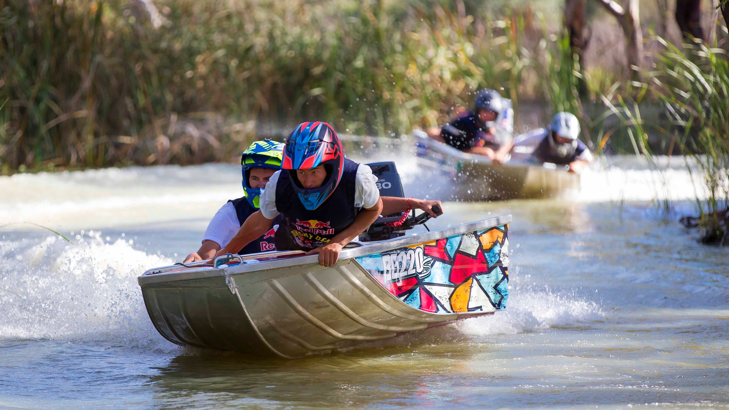 Auf der ganzen Welt Menschen Boote von unzähligen Menschen genutzt. Meistens zur Ruhe Rudern, Angeln, ... Aber nicht in der Stadt Renmark in Südaustralien, wo jedes Jahr die beliebten Schlauchboote fahren mit zwei Besatzungsmitgliedern (an Fahrer und Navigatoren) an Red Bull Dinghy Derby einreiben mit 80 km/h auf anspruchsvollem Gelände.