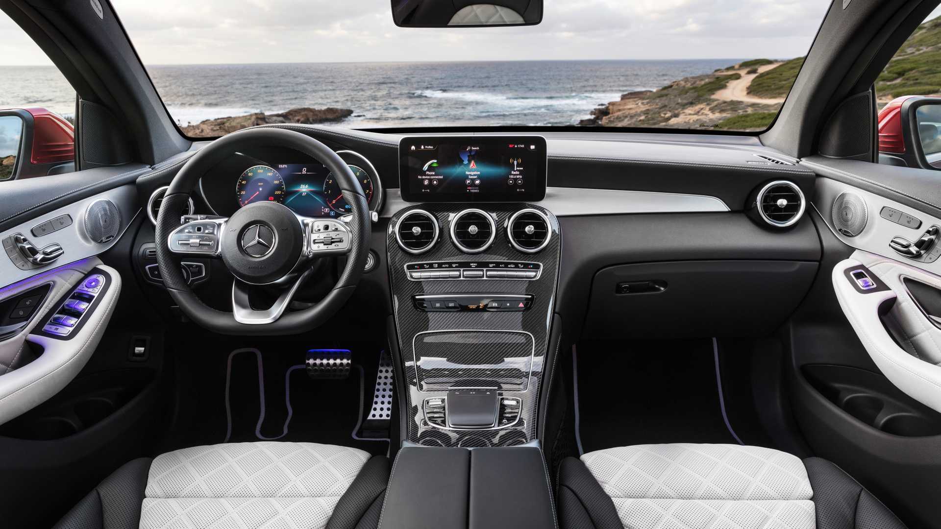 Mercedes-Benz GLC Coupé präsentierte sich in seinem neuen Image, das ist mehr muskulös, aber es ist immer noch darauf zu sehen elegant verführerische Linien. Eine beneidenswerte Figur vereint in sich Sportlichkeit Coupé und Funktionalität Geländewagen. Das Endergebnis ist ein Auto, das im Gelände fahren kann und dabei komfortabel, luxuriös und unverschämt gut aussieht. Auch der neuste Mercedes ist daran zu erkennen Dominant der vordere Teil mit einer aktualisierten Maske und Lichtern. Sein Augenmerk liegt natürlich auf dem attraktiven Coupé Gesäß, der ebenfalls über modifizierte Leuchten und noch auffälligere Endrohre verfügt. Neben der Optik kann sich das GLC Coupé rühmen leicht hybrid 48 Volt elektrisches System, das Benzinmotoren helfen soll kleiner Spritverbrauch u zu einem größeren Komfort und Leistung.